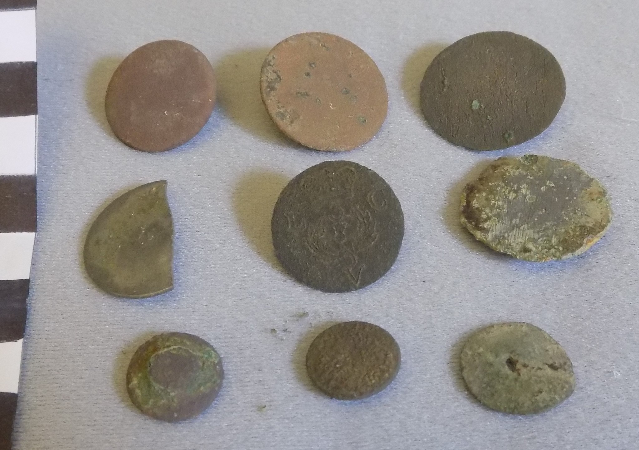 A series of varied metal detector finds by John Webb in the area of Skelbo Castle. A collection of nine metal buttons of various size, some with loop attachment and one broken. The centre button of the group has discernible markings, a crown above laurel wreath surrounding a thistle surmounted by the number 3 or 5, with letters L, left, C right and V foot of the button.