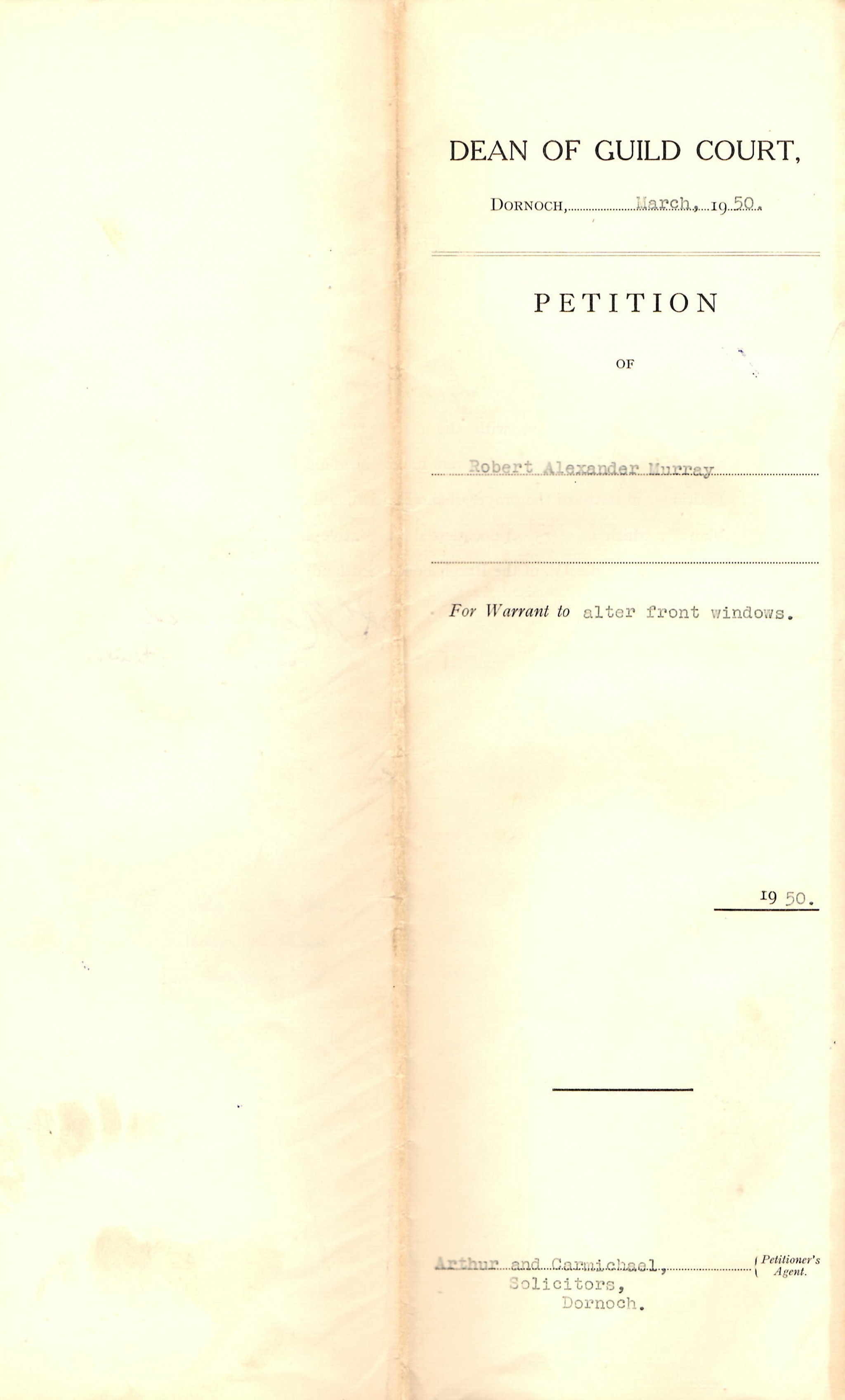 Dean of Guild Court Petition dated 17th March 1950. This folded document relates to the petition of Robert Alexander Murray, High Street, Dornoch for a warrant to replace existing windows with larger single pane windows.