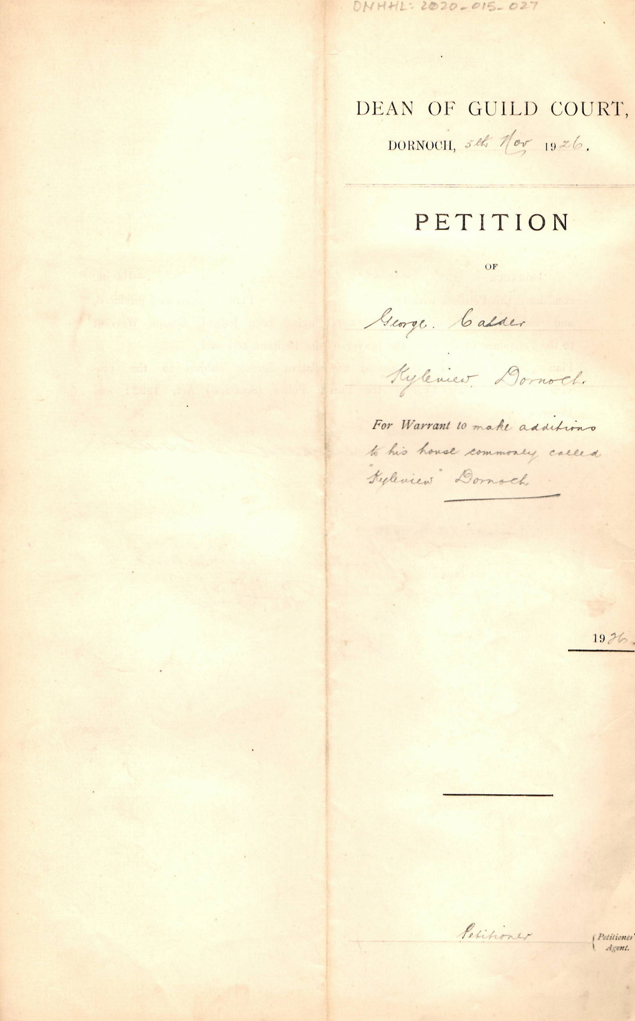 Dean of Guild Court Dornoch Petition dated 5th November 1926. This folded document relates to the Petition of George Calder for a warrant to make additions to his house commonly called 'Kyleview', Dornoch. Two respondents, including the Duke of Sutherland, were served copies of the petition. No objections were received and the warrant was granted.