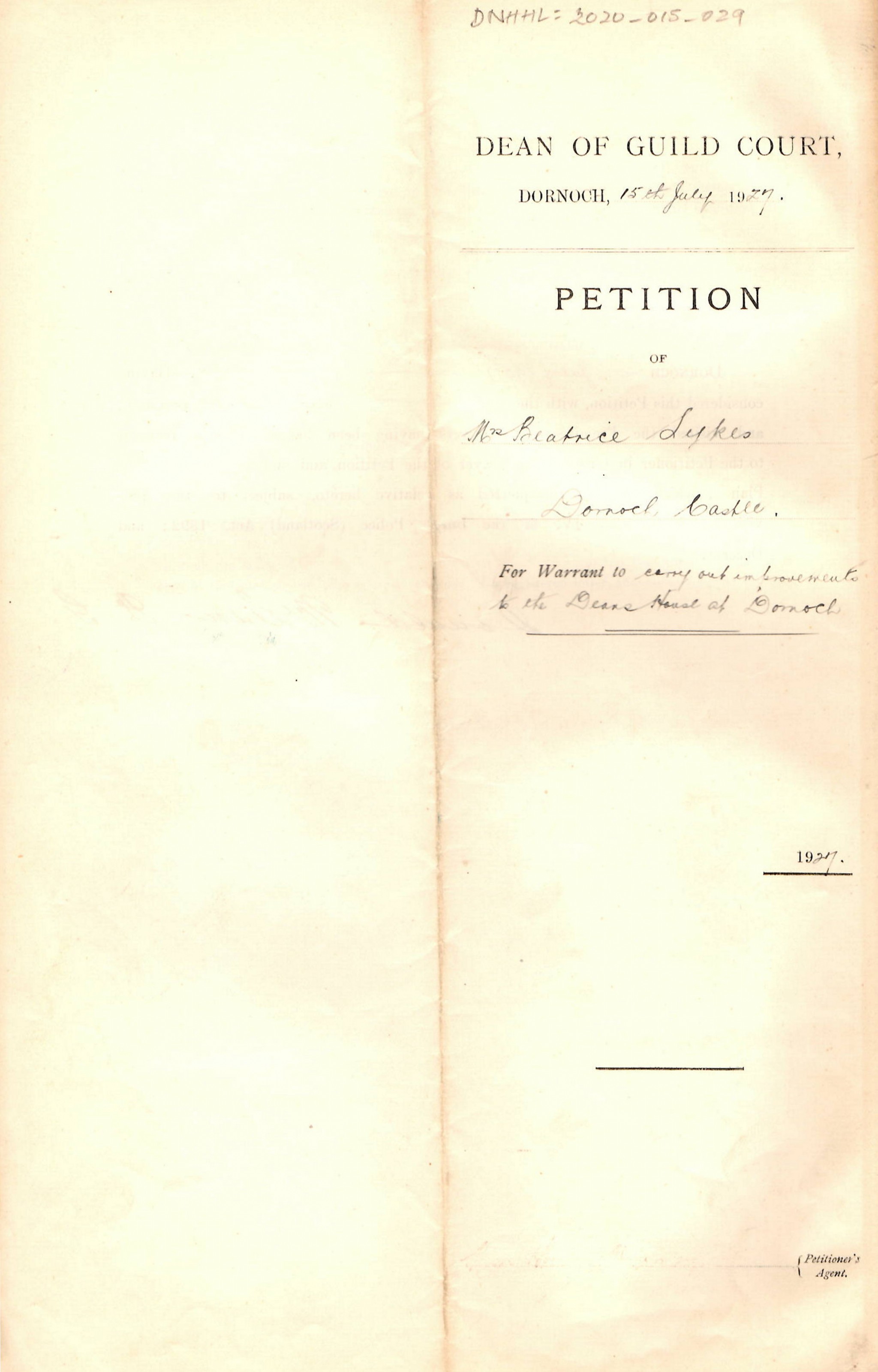Dean of Guild Court Dornoch Petition dated 15th July 1927. This folded document relates to the Petition of Mrs Beatrice Sykes of Dornoch Castle for a warrant for improvements to the Deans House of Dornoch. Two respondents were named in the petition. No objections were received and the warrant was granted.