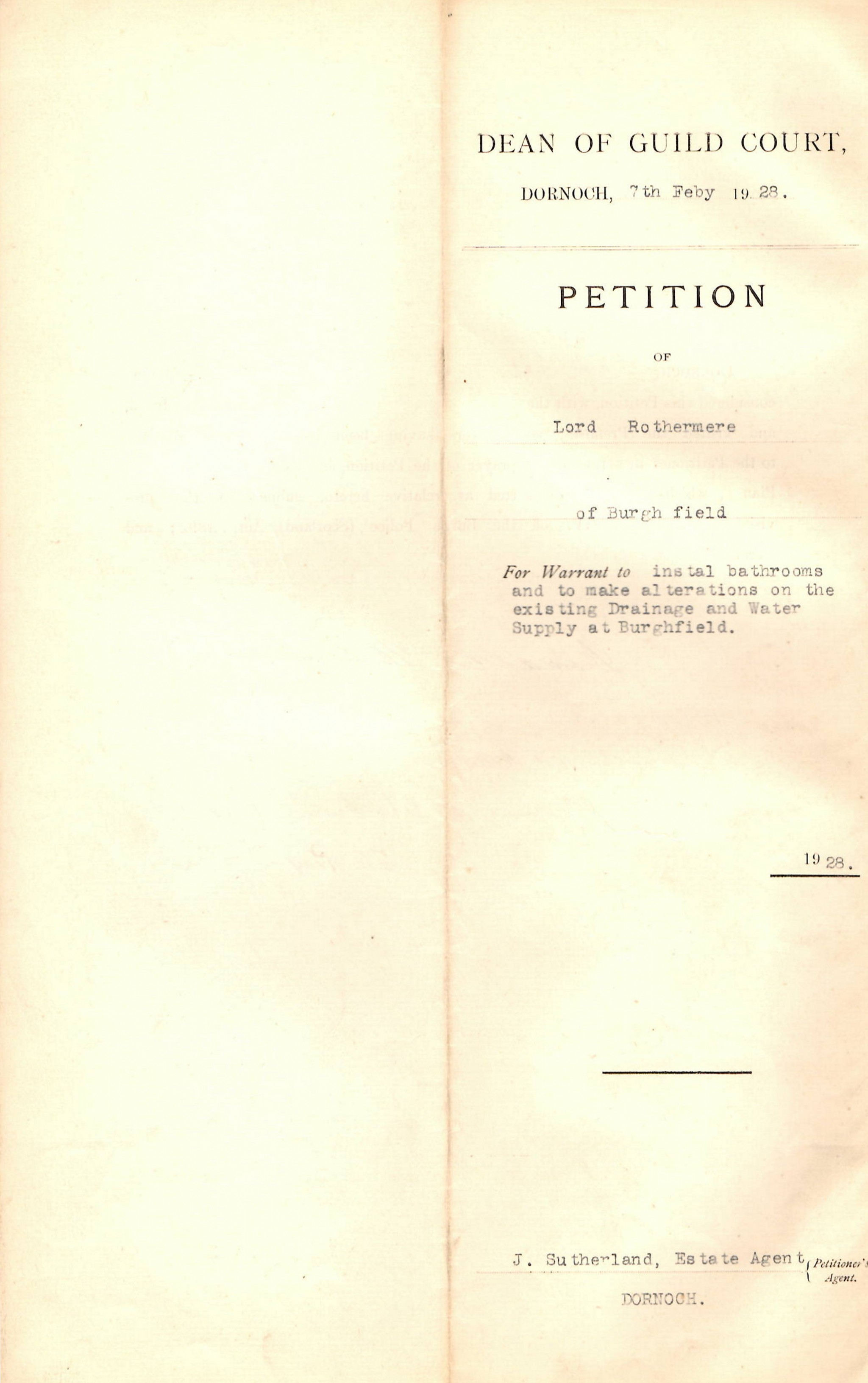 Dean of Guild Court Dornoch Petition dated 7th February 1928. This folded document relates to the Petition of Lord Rothemere for a warrant to install bathrooms and make alterations to the existing drainage and water supply to Burghfield, Dornoch. One respondent was named in the petition. No objections were received and the warrant was granted.