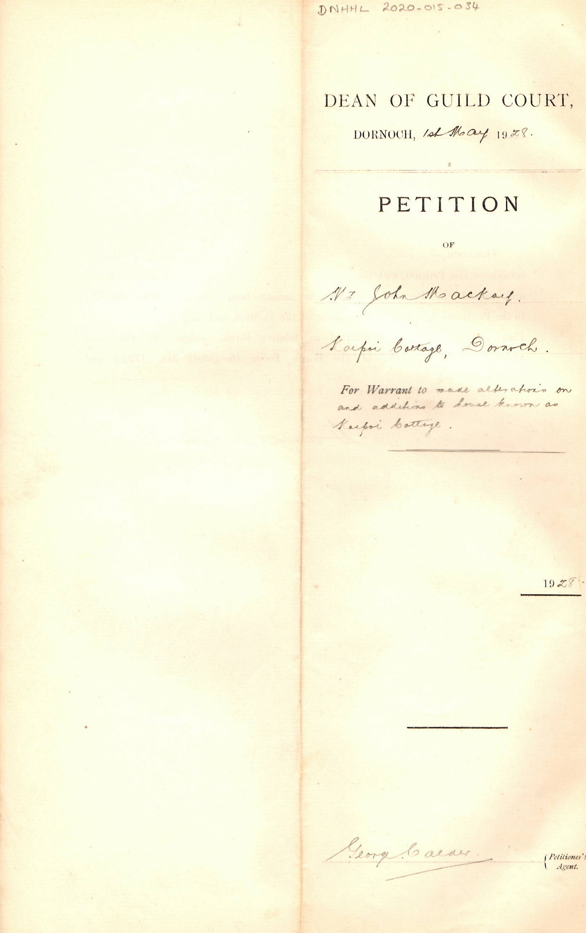Dean of Guild Court Dornoch Petition dated 1st May 1928. This folded document relates to the Petition of Mr John Mackay of Kaipoi Cottage, Dornoch for a warrant to alterations and additions to the house known as Kaipoi Cottage, Dornoch. Two respondents were served copies of the petition. No objections were received and the warrant was granted.