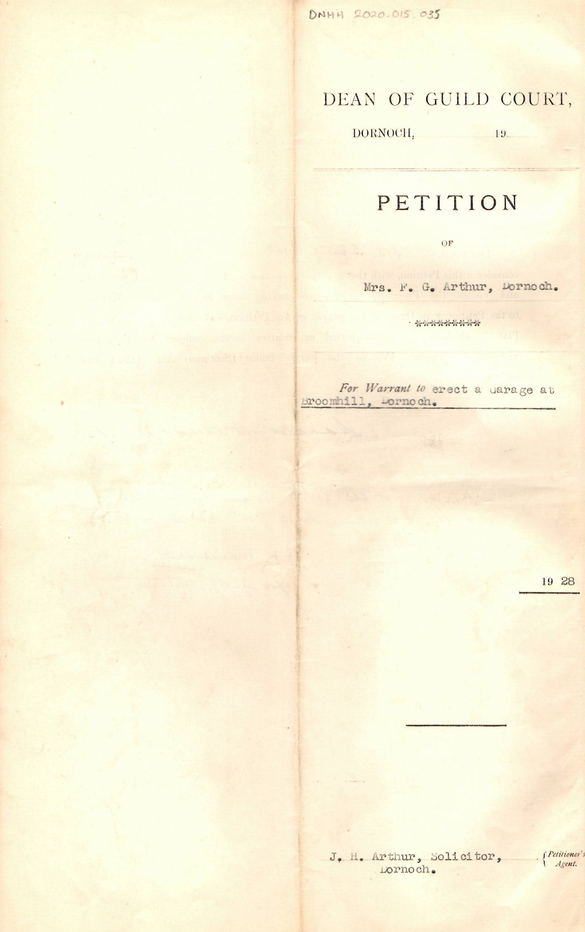 Dean of Guild Court Dornoch Petition dated 19th March 1928. This folded document relates to the Petition of Mrs Florence Georgina Ann Smith for a warrant to erect a garage on ground held in fue,from the Duke of Sutherland, at Broomhill, Dornoch. One respondent was named. No objections were received and the warrant was granted.