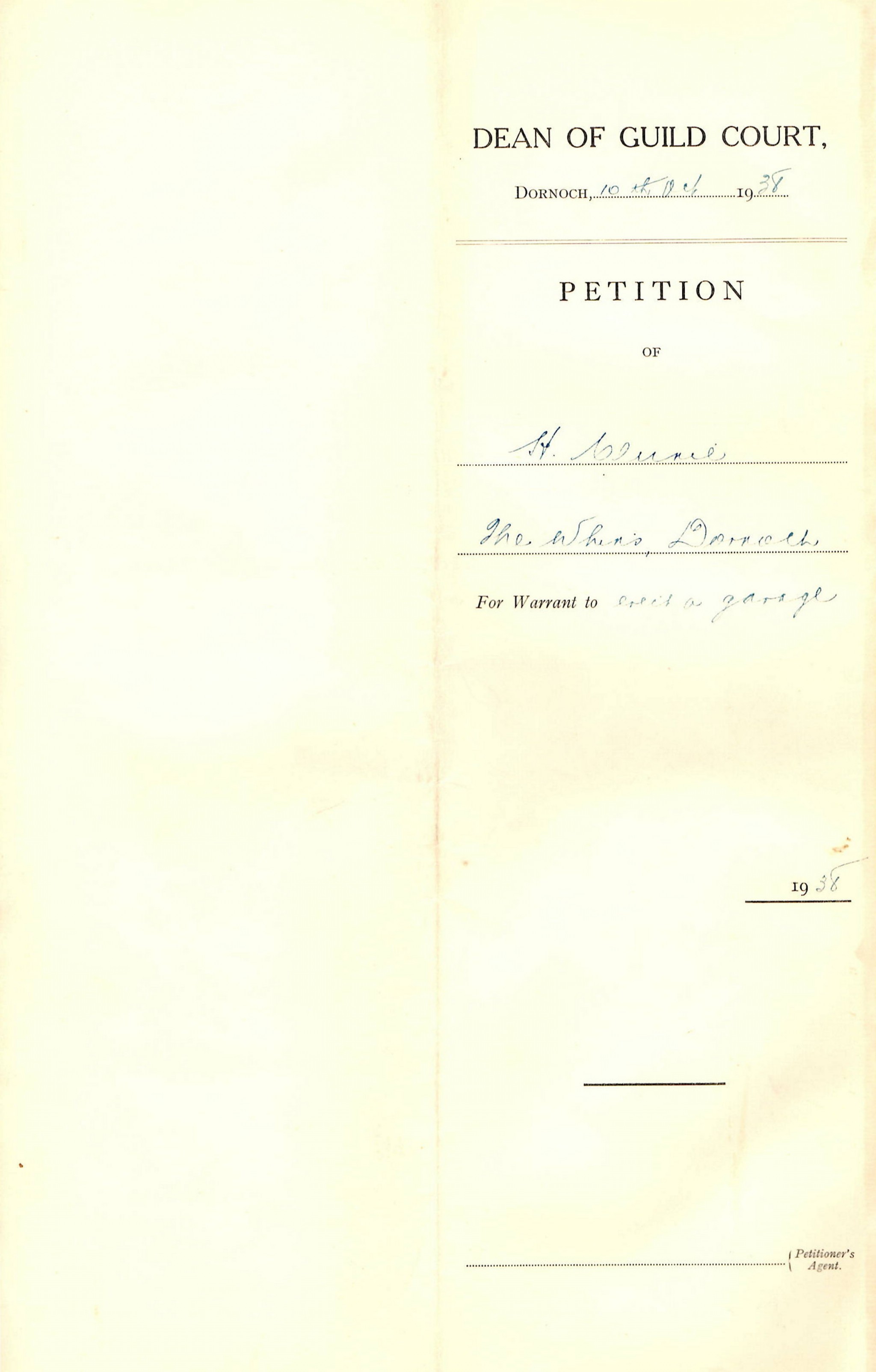 Dean of Guild Court Dornoch Petition dated 10th October 1938. This folded document relates to the Petition of Mr H Clunie, The Whins, Dornoch for a warrant to erect a garage. Two respondents were named. There is no record of copies of the petition having been served. No objections were received and the warrant was granted.