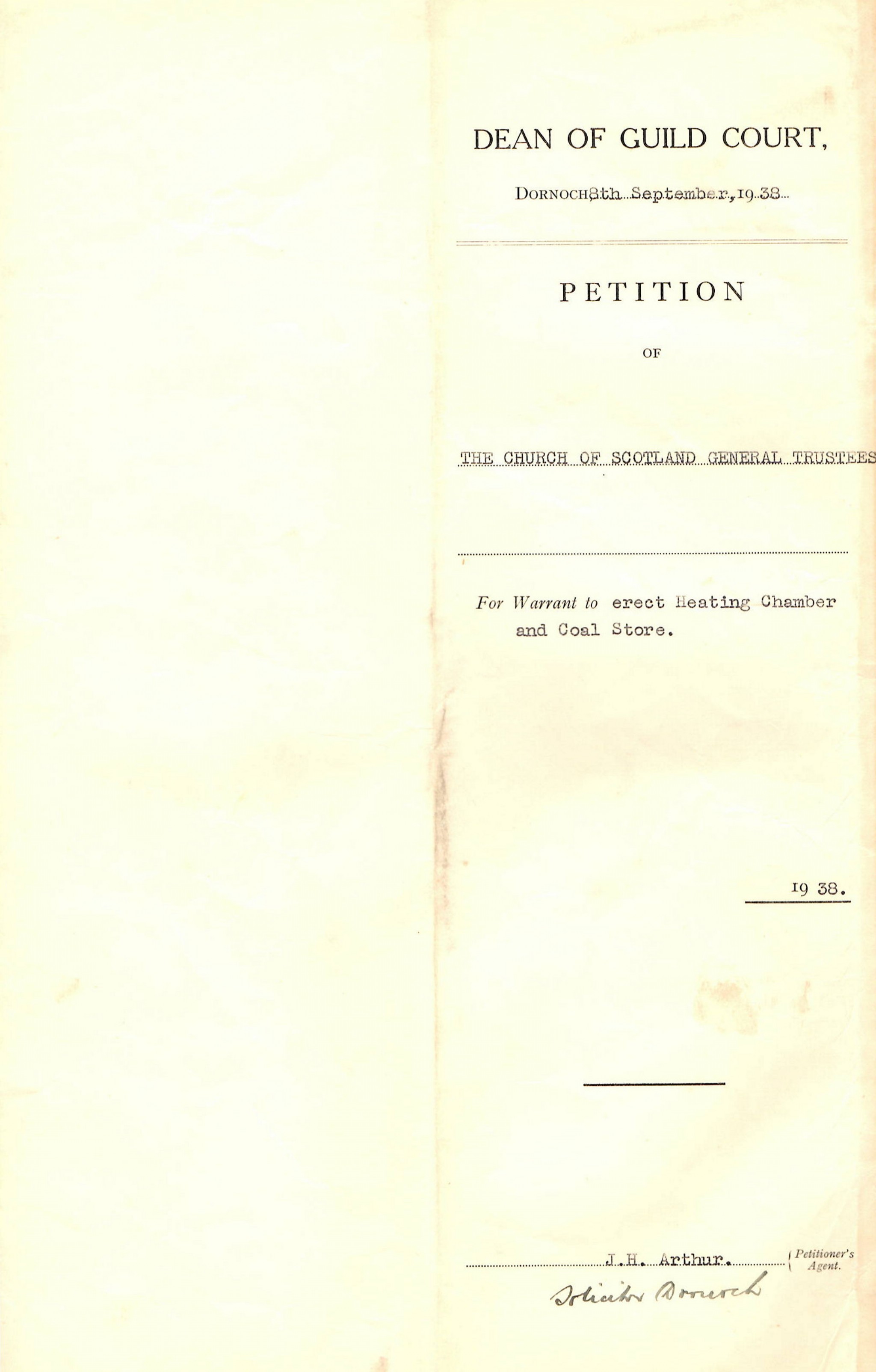 Dean of Guild Court Dornoch Petition dated 8th September 1938. This folded document relates to the Petition of The Church of Scotland General Trustees for a warrant to erect a heating chamber and coal store at the Cathedral of Dornoch. One respondents was named/ There is no record of a copy of the petition being served. No objections were received and the warrant was granted.