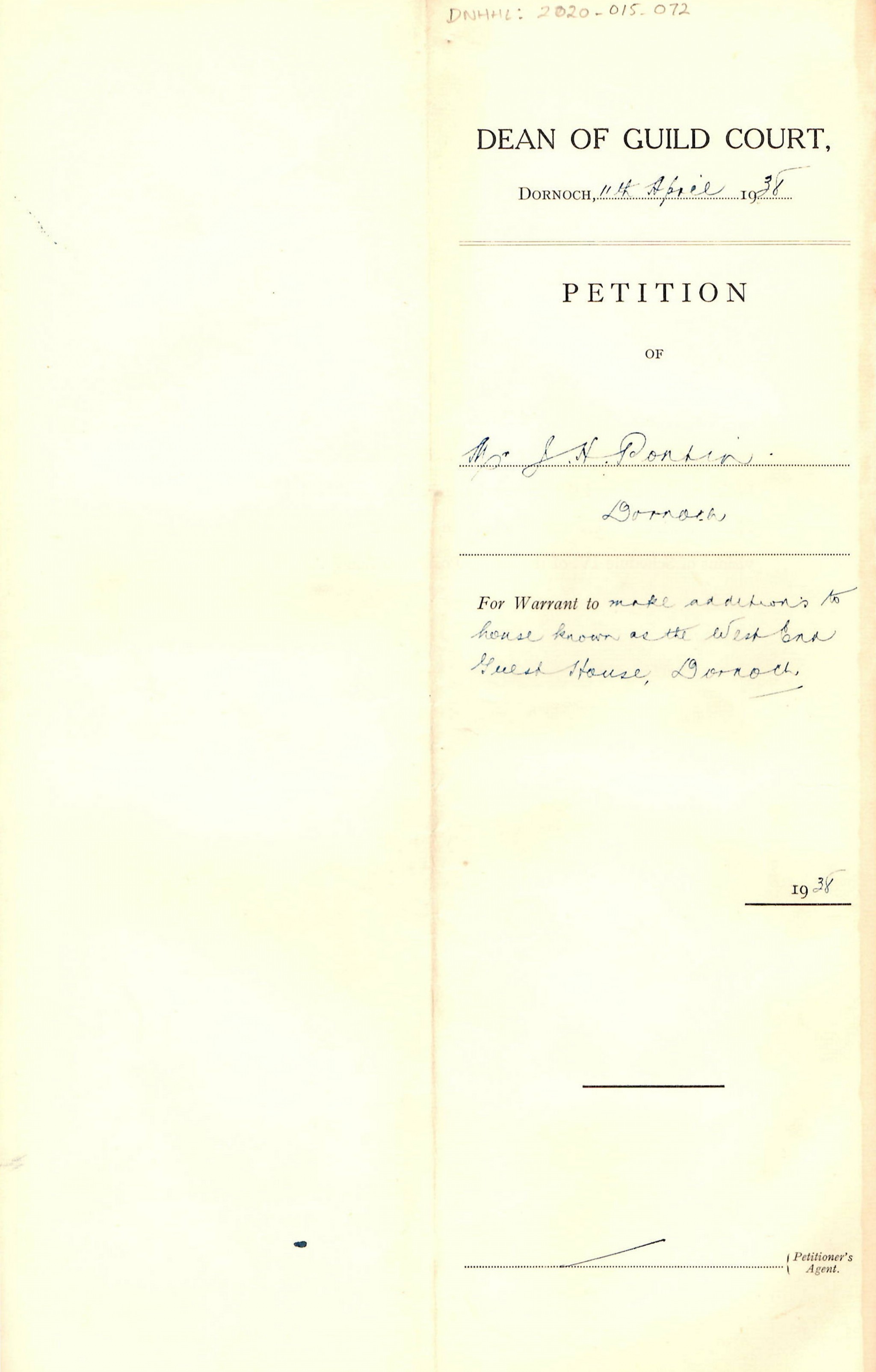 Dean of Guild Court Dornoch Petition dated 11th April 1938. This folded document relates to the Petition of J A H Pontin for a warrant to make additions to West End Guest House, Cnoc an Lobht, Dornoch. Two respondents were named. There is no record of copies of the petition having been served. No objections were received and the warrant was granted.