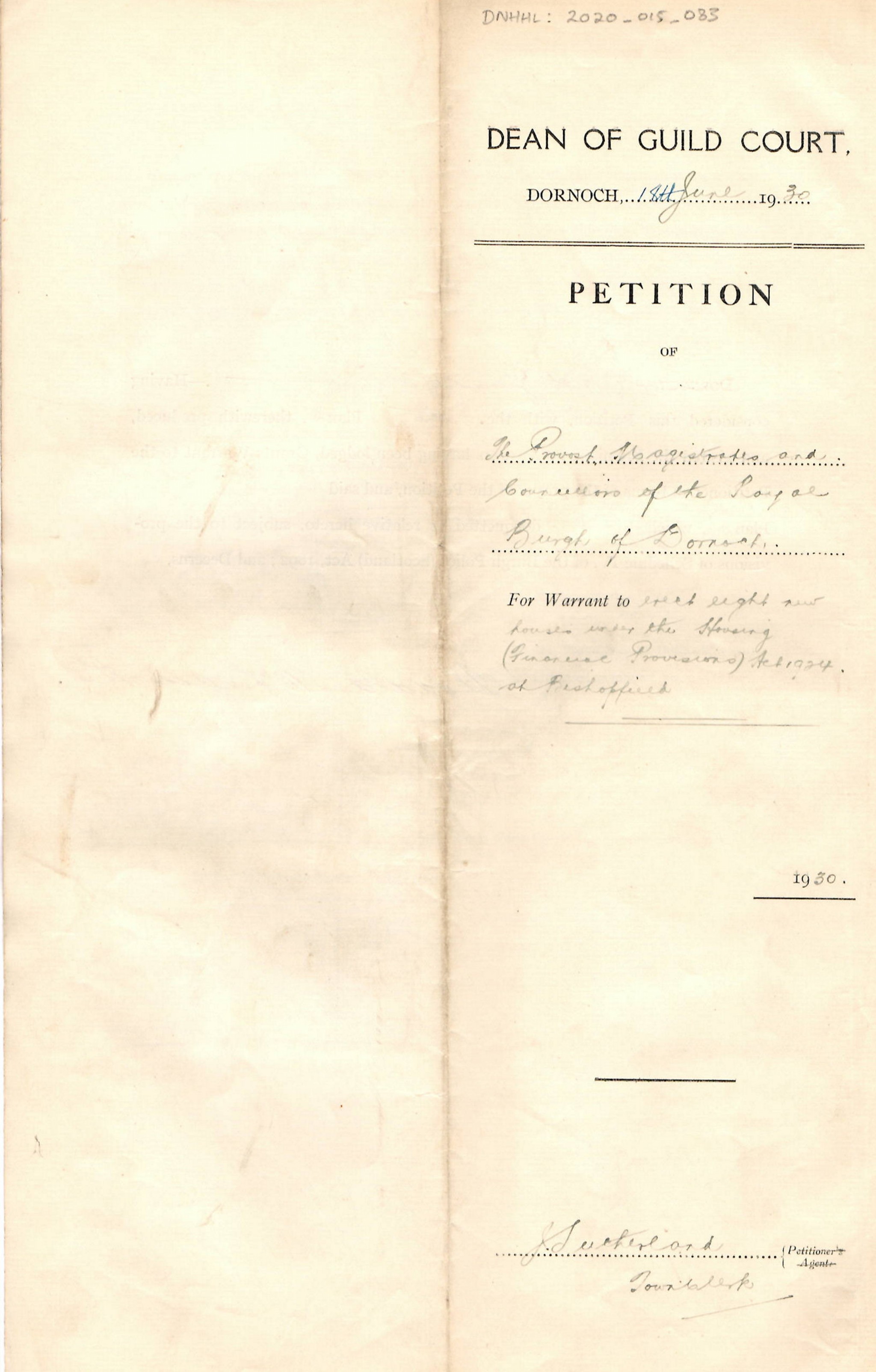 Dean of Guild Court Dornoch Petition dated 18th June 1930. This folded document relates to the Petition of the Provost, Magistrates and Councillors of the Royal Burgh of Dornoch for a warrant to erect 8 new houses in Bishopfield. Three respondents were named. No objections were received and the warrant was granted.