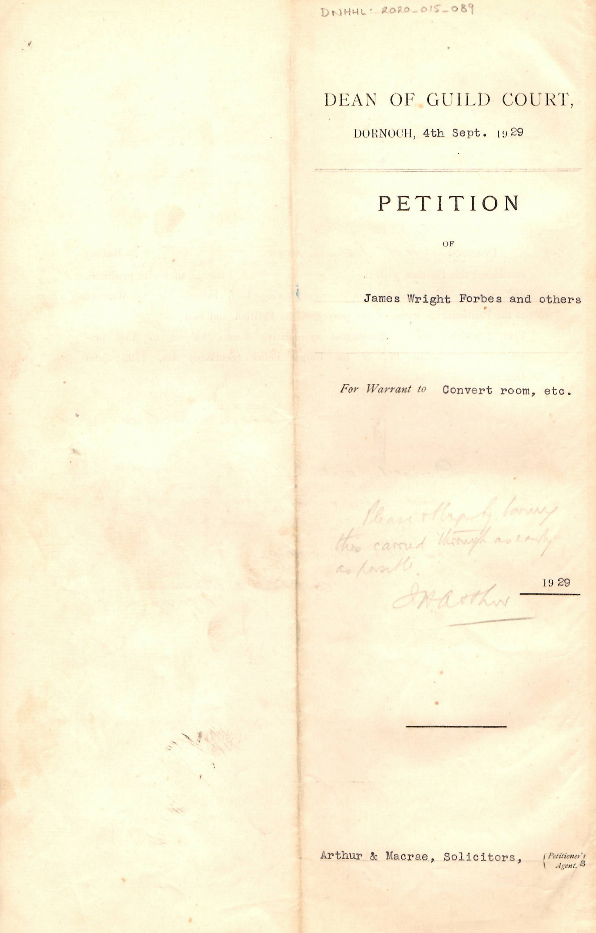 Dean of Guild Court Dornoch Petition dated 4th September 1929. This folded document relates to the Petition of James Wright Forbes and others for a warrant to convert a room on the second floor of the Old School Buildings, Schoolhill, Dornoch into a dwelling house. Five respondents were named. There is no record of petitions being served. No objections were received and the warrant was granted.
