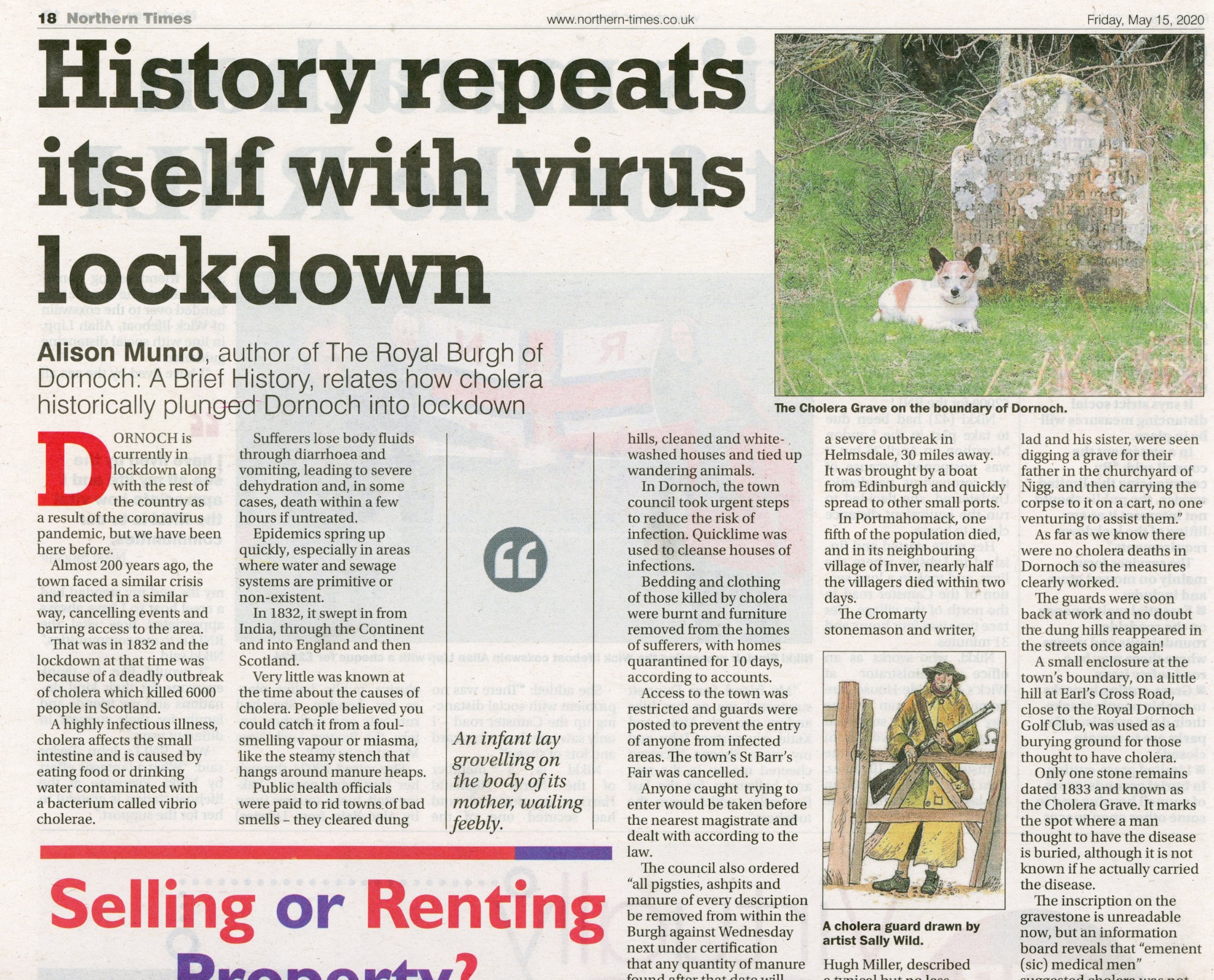 A newspaper article from the Northern Times published 15 May 2020 in which Alison Munro, author of "The Royal Burgh of Dornoch: a brief history", highlights that Dornoch, currently in lockdown as a result of the Corona virus pandemic, faced a similar situation in 1832 when faced with a deadly outbreak of cholera which killed nearly 6000 people in Scotland.