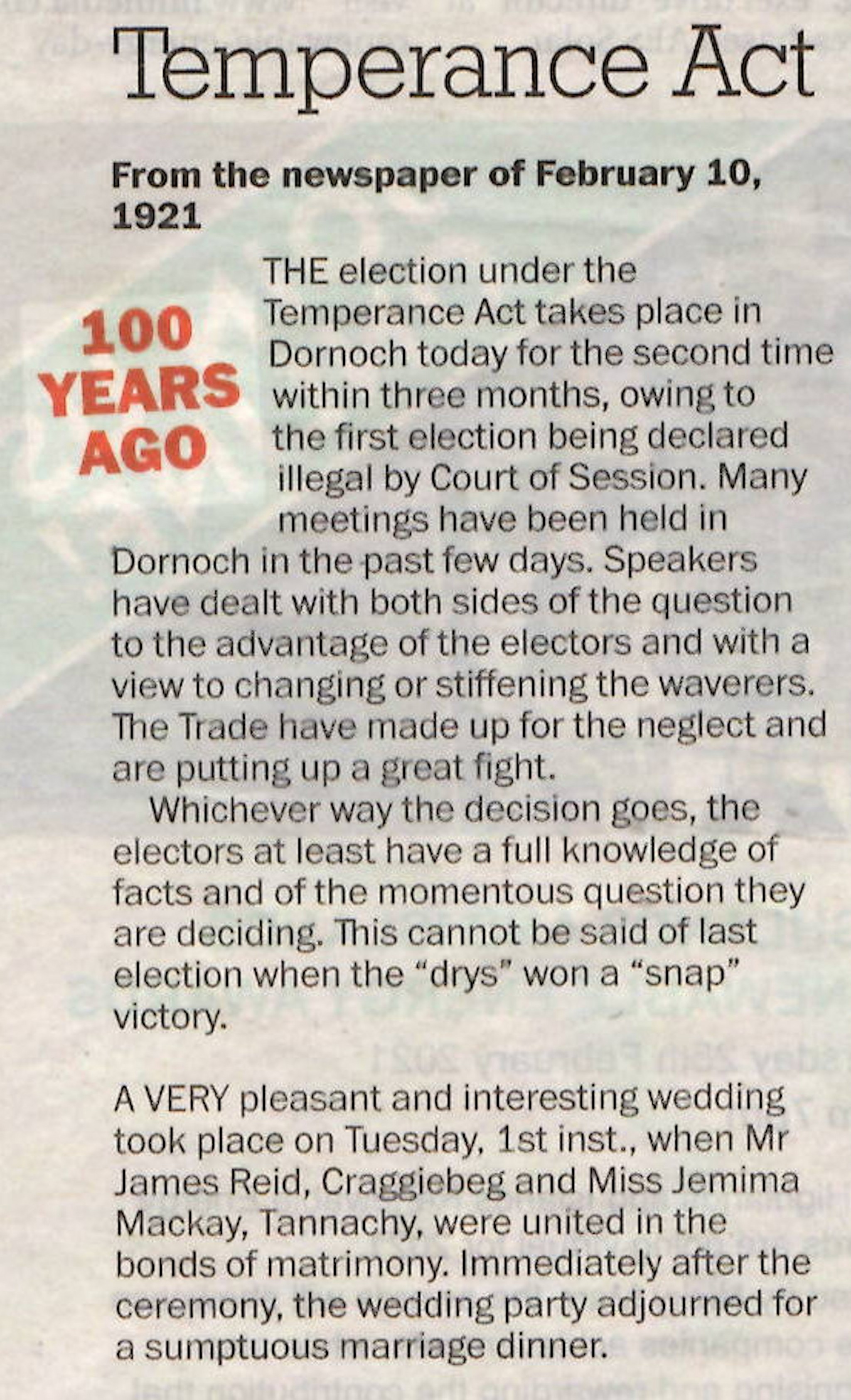 Second of a series of extracts from the Northern Times (Times Past) - 'Temperance Act' concerning an election under the Temperance Act taking place in Dornoch for the second time within three months, owing to the first election being declared illegal by Court of Session.