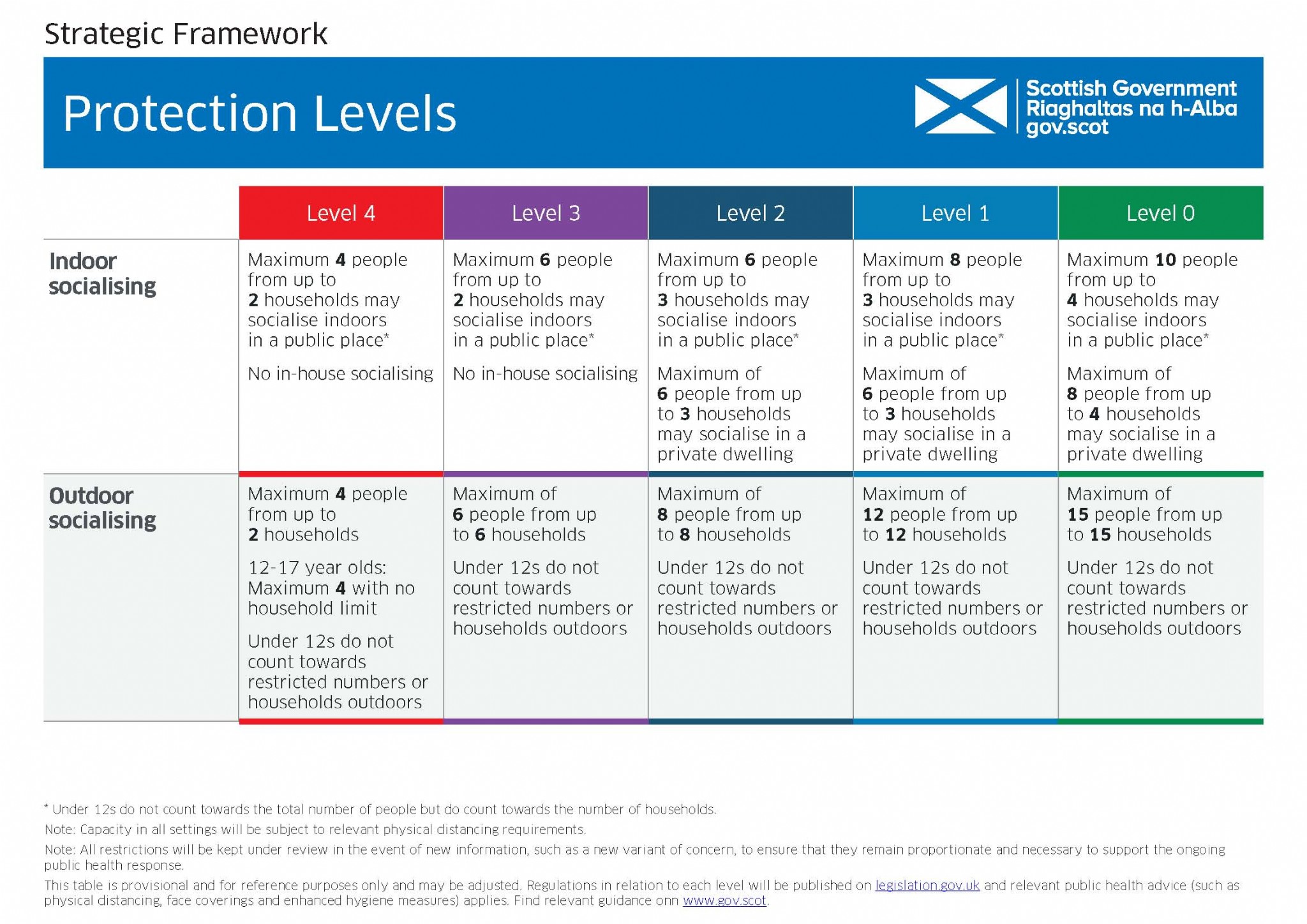 Series of nine information documents published by the Scottish Government in 2021 relating to the Covid-19 pandemic. The first a copy of a 10 page document issued by the Scottish Government outlining the strategic framework of protection levels for COVID-19. The document was made available for download online in June 2021.