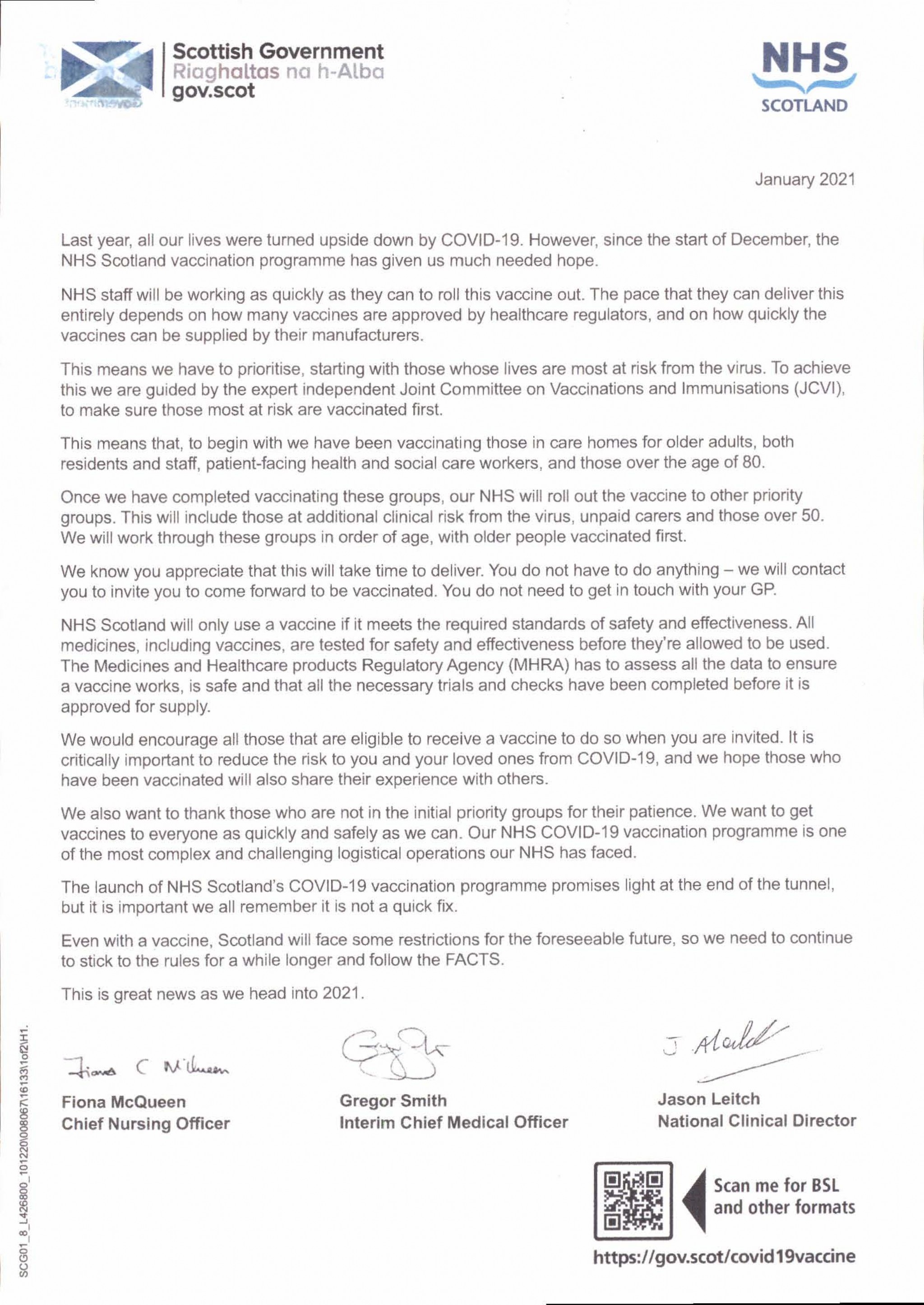 Fourth in a series of information documents published by the Scottish Government in 2021 relating to the Covid-19 pandemic, a copy of a letter of January 2021, signed by the Chief Nursing Officer, Interim Chief Medical Officer and National Clinical Director concerning the NHS Scotland vaccination programme. The reverse of the letter has a memorandum 'Know Your Covid Protection Level' highlighting the simple postcode checker.