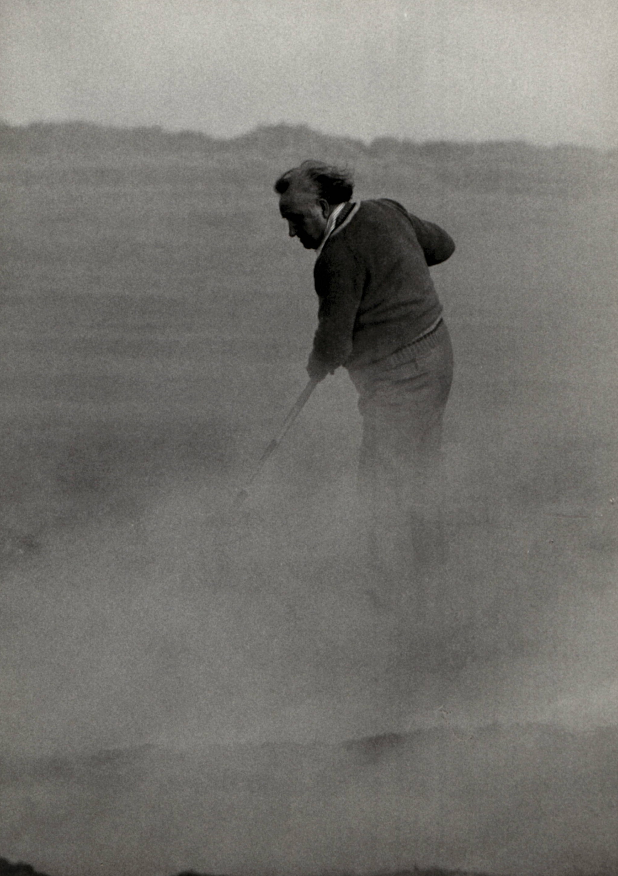 From a collection of ten monochrome photographs recording the building of cricket pitch at Dornoch links in the area subsequently occupied by the golf driving range. Ron Cameron tending the bonfire - obviously a long task!