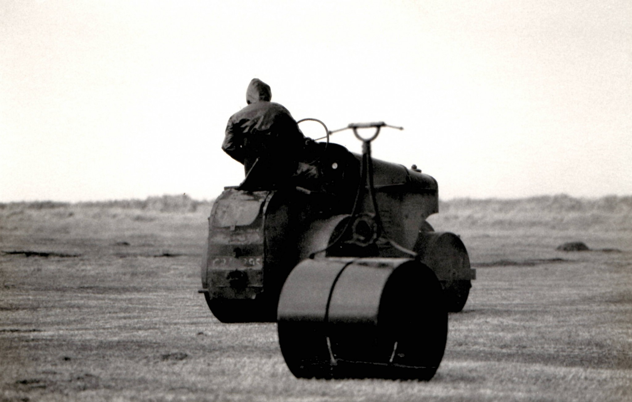 From a collection of ten monochrome photographs recording the building of cricket pitch at Dornoch links in the area subsequently occupied by the golf driving range. Stuart Gardiner operating the motor roller.