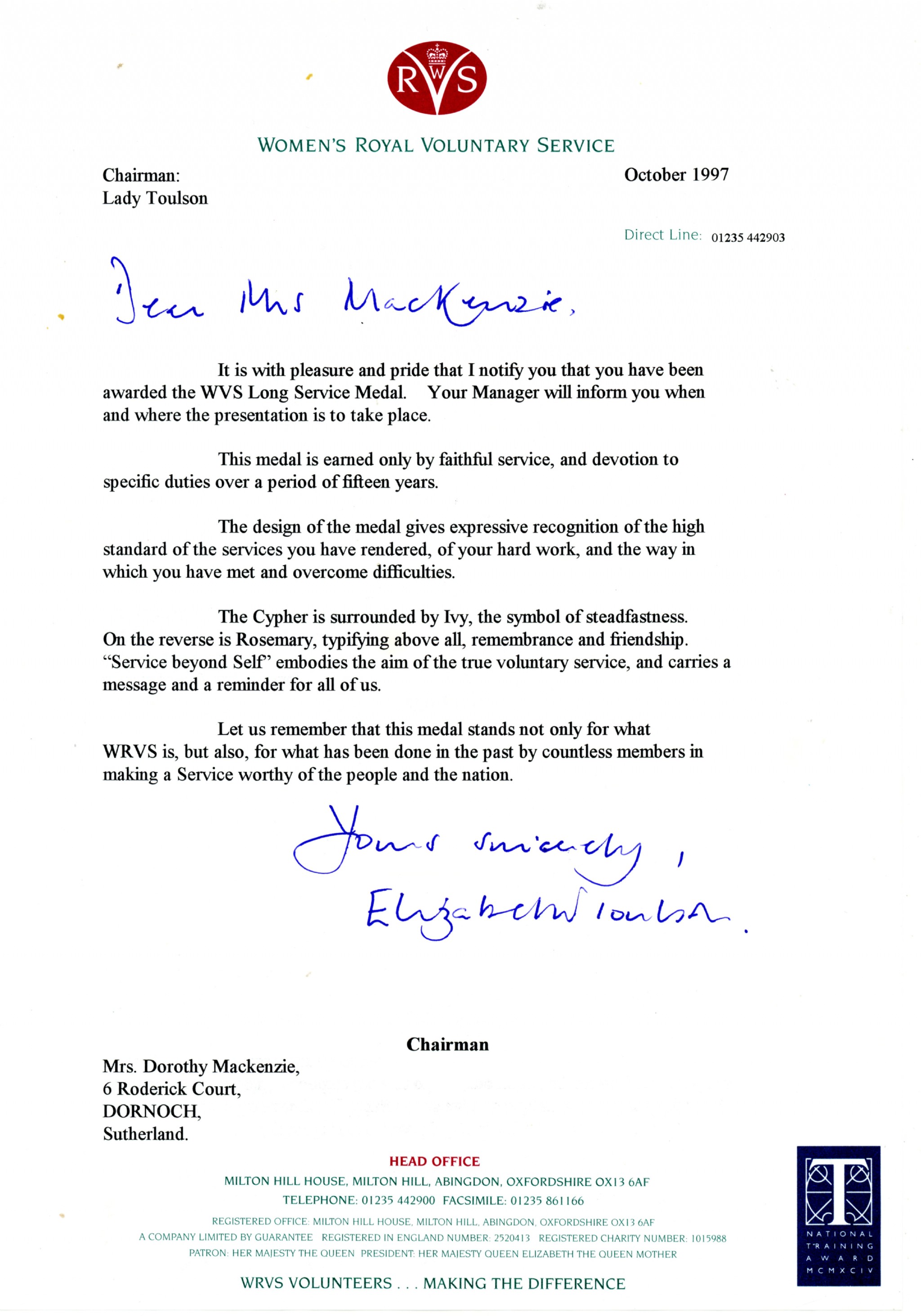 A typewritten letter on headed stationery from Lady Toulson, Chairman Women's Royal Volunteer Service to Mrs Dorothy Mackenzie dated October 1997. The letter provides notification of the award to Mrs Mackenie of the WRVS Long Service Medal which is "earned only by faithful service, and devotion to specific duties over a period of fifteen years". The letter advises that:"Your Manager will inform you when and where the presentation is to take place."