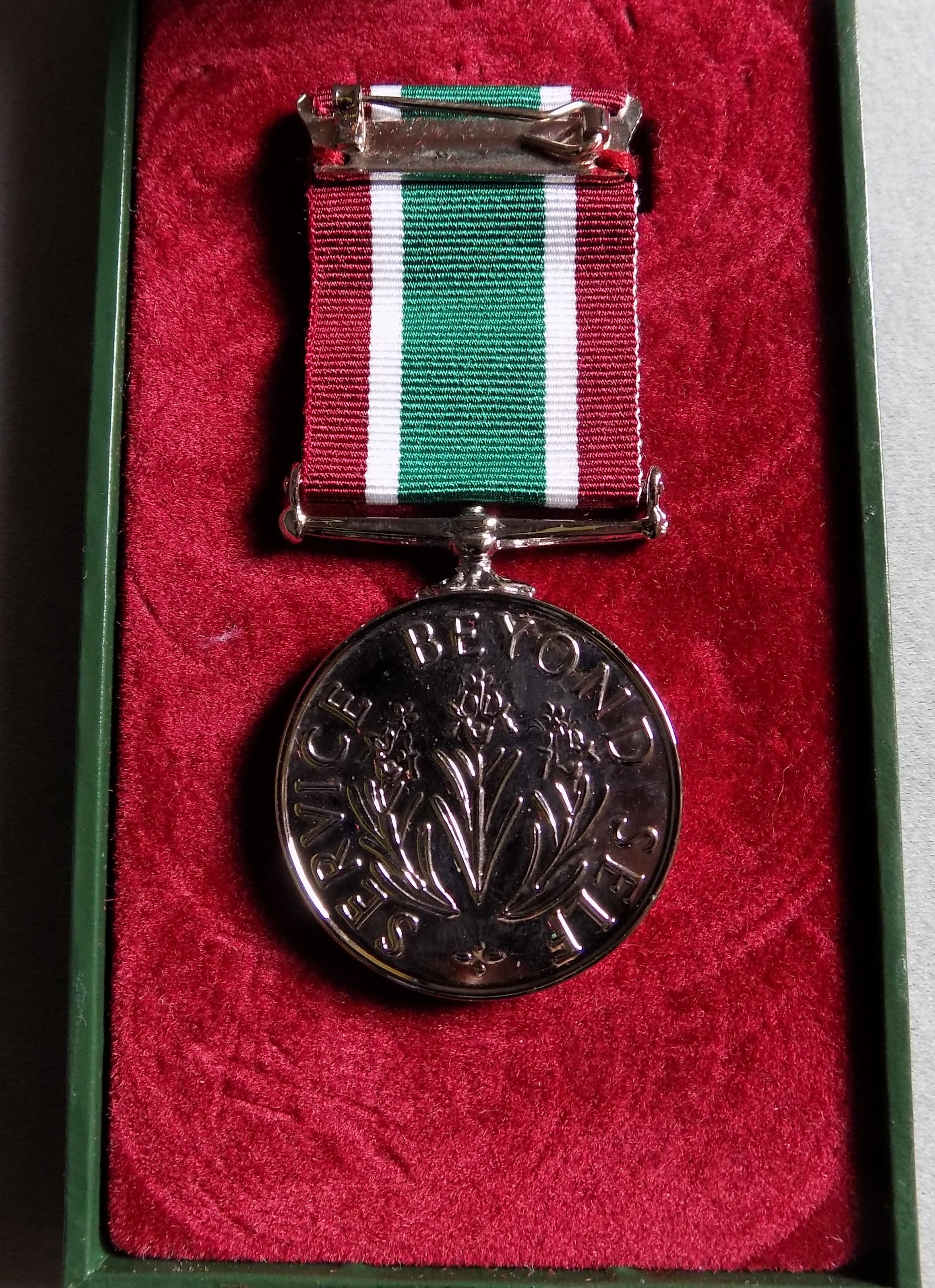 The Women's Voluntary Service Long Service Medal awarded to Mrs Dorothy Mackenzie reverse with inscription "Service Beyond Self" in its presentation box. The obverse bears the WRVS intertwined letters.