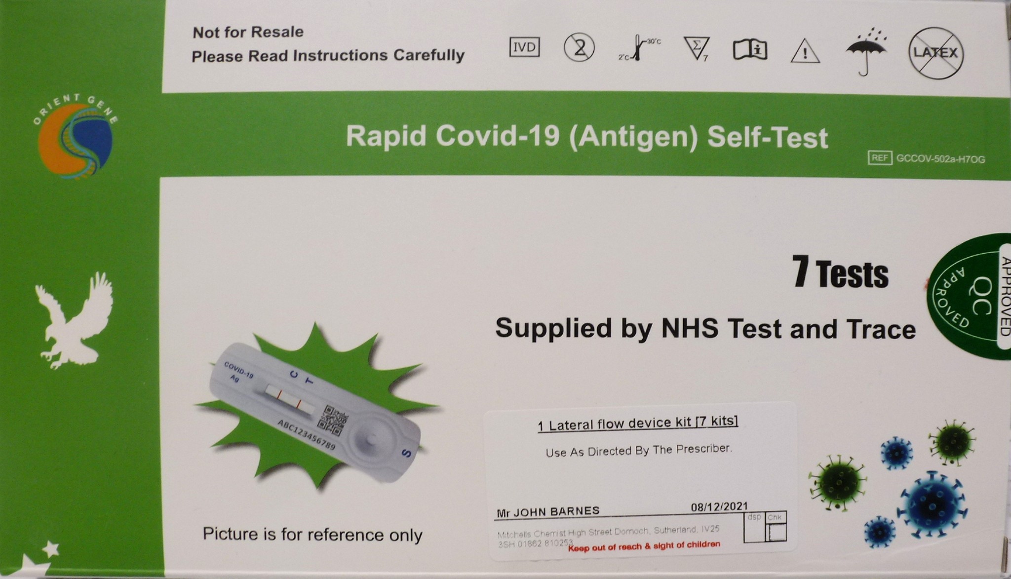 At the end of 2021 a new Orient Gene's Rapid Covid-19 (Antigen) Self-Test Kit (commonly referred to as the 'Lateral Flow Test') was distributed free of charge from pharmacies. This test kit differed from the previous test kit (see 2021_035_09 picture #14710) in that it was no longer necessary to swab the tonsils on each side of the mouth, followed by using the same swab in one nostril; in lieu the swabbing process was inside both nostrils. This change was considered a distinct advantage, the tonsil process inducing unpleasant, involuntary retching. The time for the new test to produce a result was also reduced from 30 mins to 20. With the onset of the Omicron Covid-19 variant in December 2021, with a high rate of infections, lateral flow self-testing became increasingly important. In keeping with the earlier version, the kit contained a pamphlet providing clear instructions on its use (see linked pdf).
