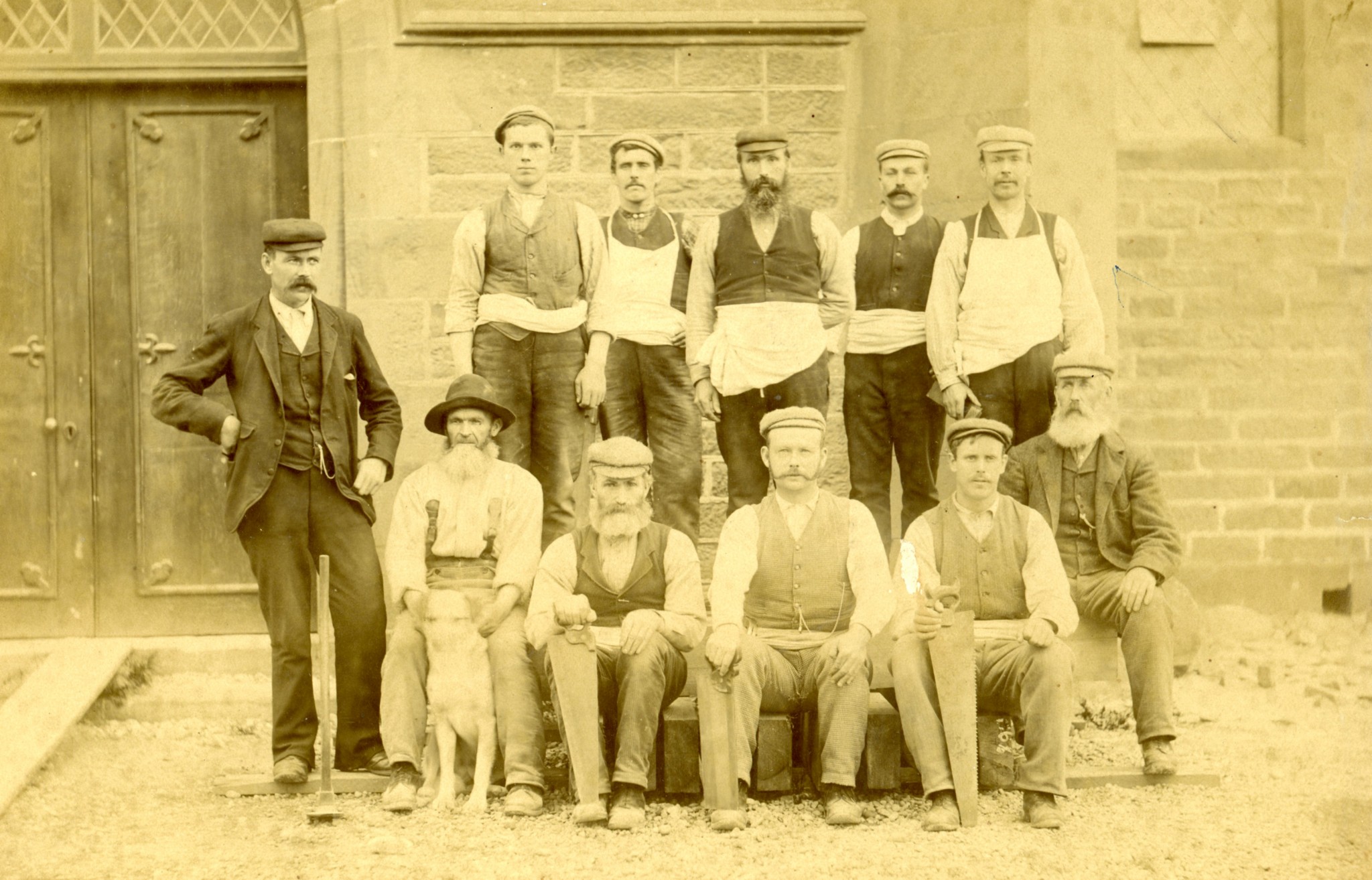 Sepia photograph of workmen (carpenters), with dog, outside Dornoch Free Church c 1880/ The photograph is mounted on card with names handwritten on reverse. Identified are: backrow J J Sutherland (Rearquhar); ? ; George Matheson; John Sutherland and Murray (Embo) holding a scribe for scoring wood pre-cutting. Peter Murray (Ray MacDonald's grandfather) is standing on the left with an adze in front. Front row seated left of right: Andy Grey; Andrew Graham (with cross-cut saw); Angie Ross (Astle) with a tenon saw; Hector Munro (Hugh's father) with a rip saw; Tom Grant (Architect).