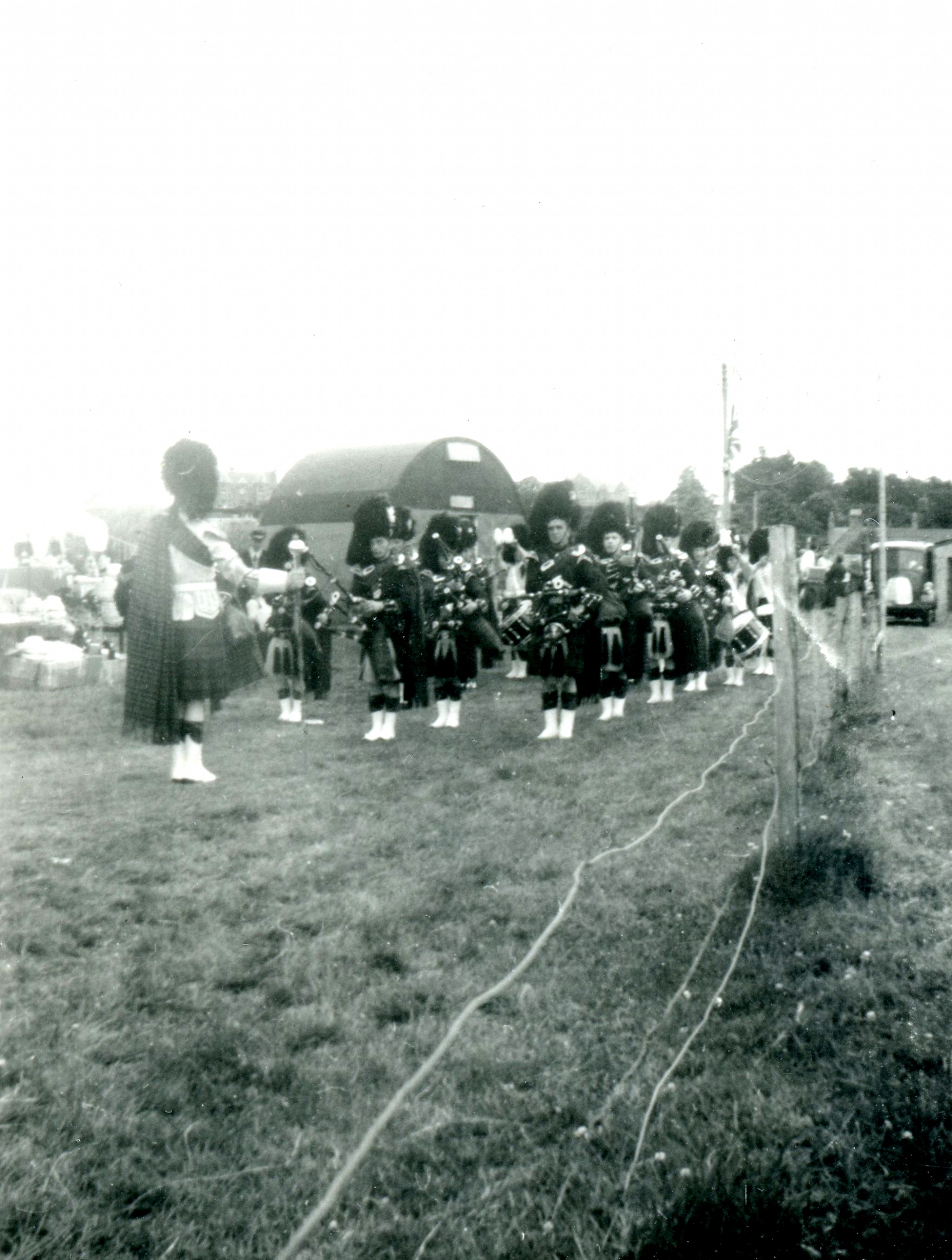Monochrome photograph of Dornoch Pipe Band, year unknown, possibly taken at the Dornoch Highland Games