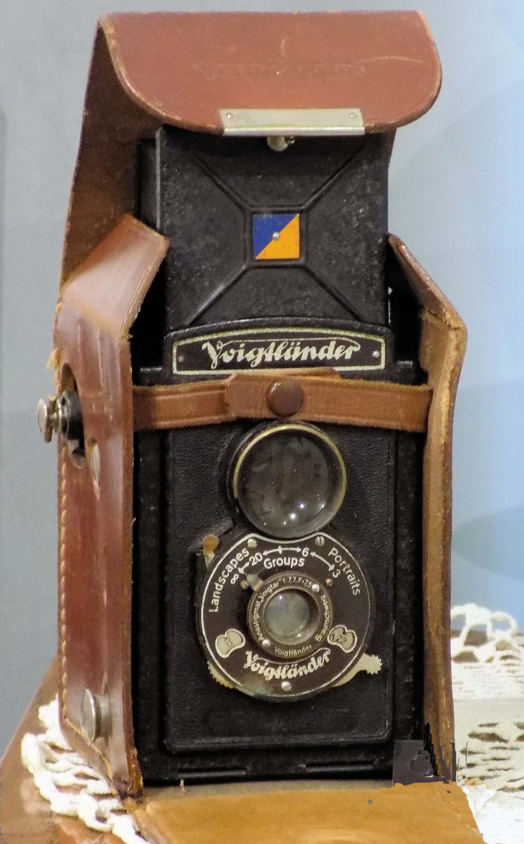 A colour photograph of Miss Lyon’s Voigtlander camera in its leather case. The camera was on loan from Mr G Sawyer for the period of the Miss Lyon exhibition. The leather case top flap provides ready access the viewfinder, with its surrounding metal shield to provide shading. The focusing lens surmounts the camera lens on the front of the camera, with the camera lens surround bearing the German maker’s name Voigtlander Braunschweig. There are only rudimentary 'f' stop and lens focusing settings, requiring photographic experience, with or without a light meter, in the selection of ‘f' stop (aperture thus depth of focus).