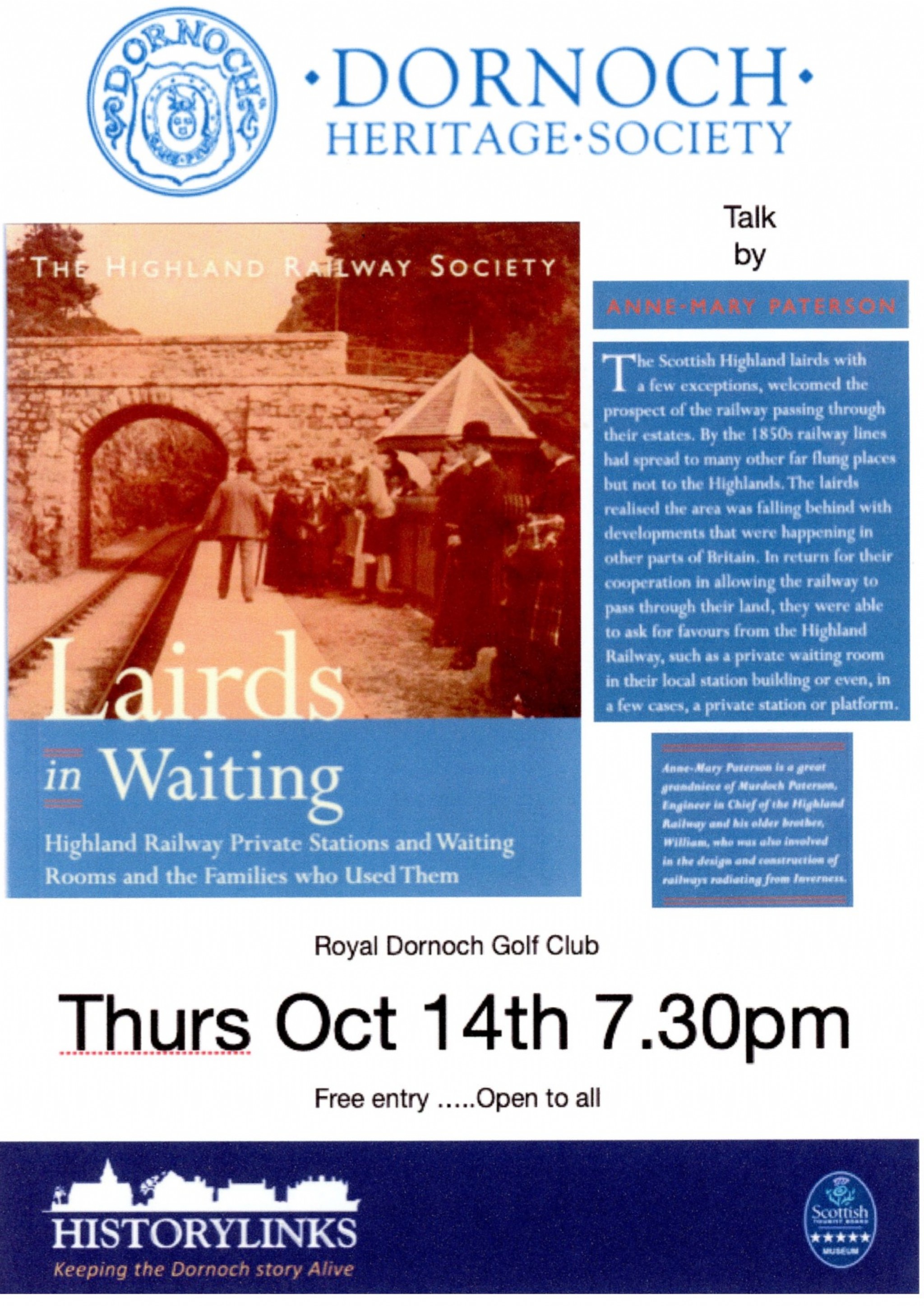 Talk given to DHS at Royal Dornoch Golf Club on Thursday 16th October 2021 by Anne-Mary Paterson. - 'Lairds in Waiting - Highland Railway Private Stations and Waiting Rooms and the families that used them'.