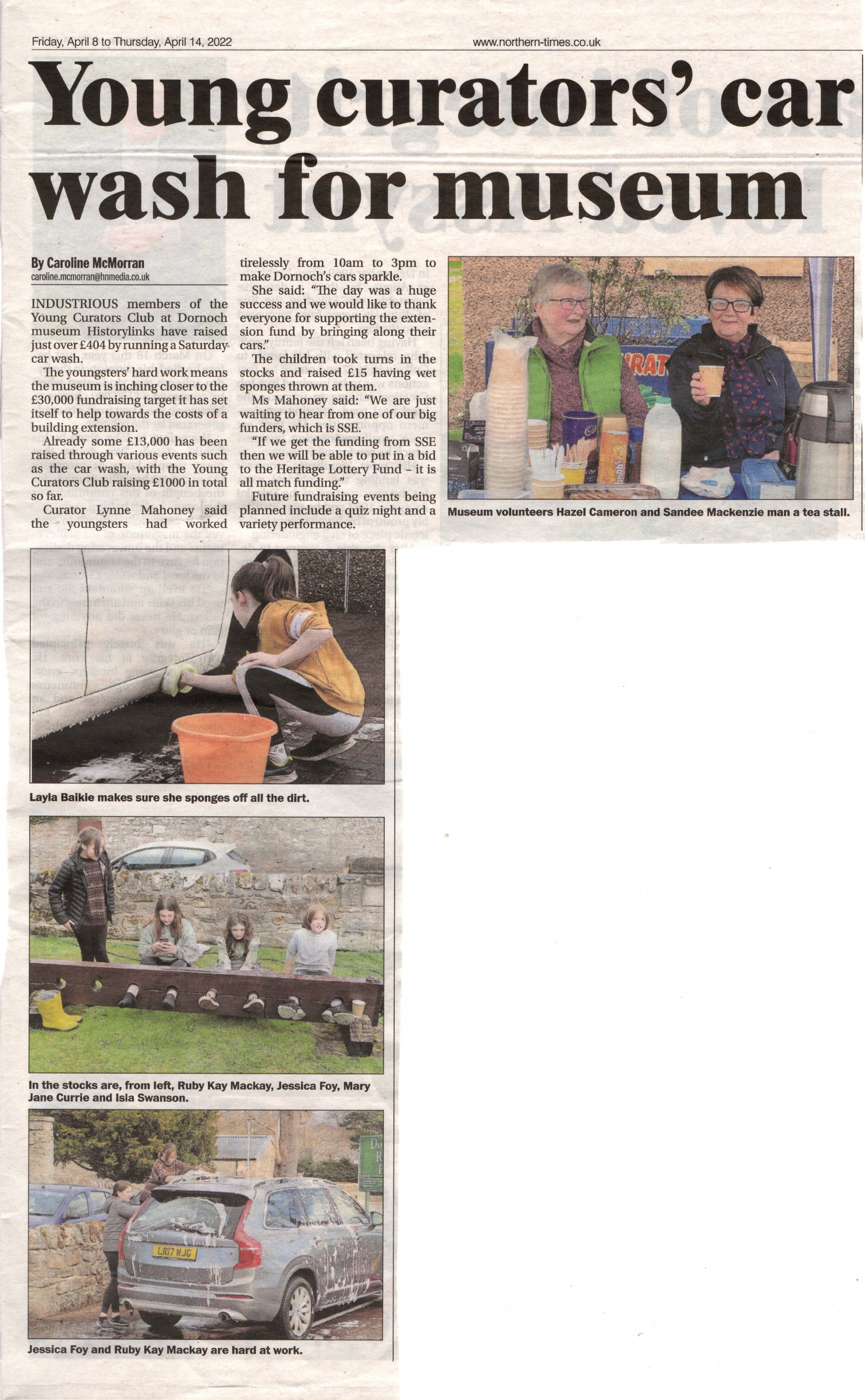 Cutting from Northern Times of 14/4/2022 with 4 colour photographs about the Young Curators' Club car wash in support of th museum extension fund on 10th April 2022