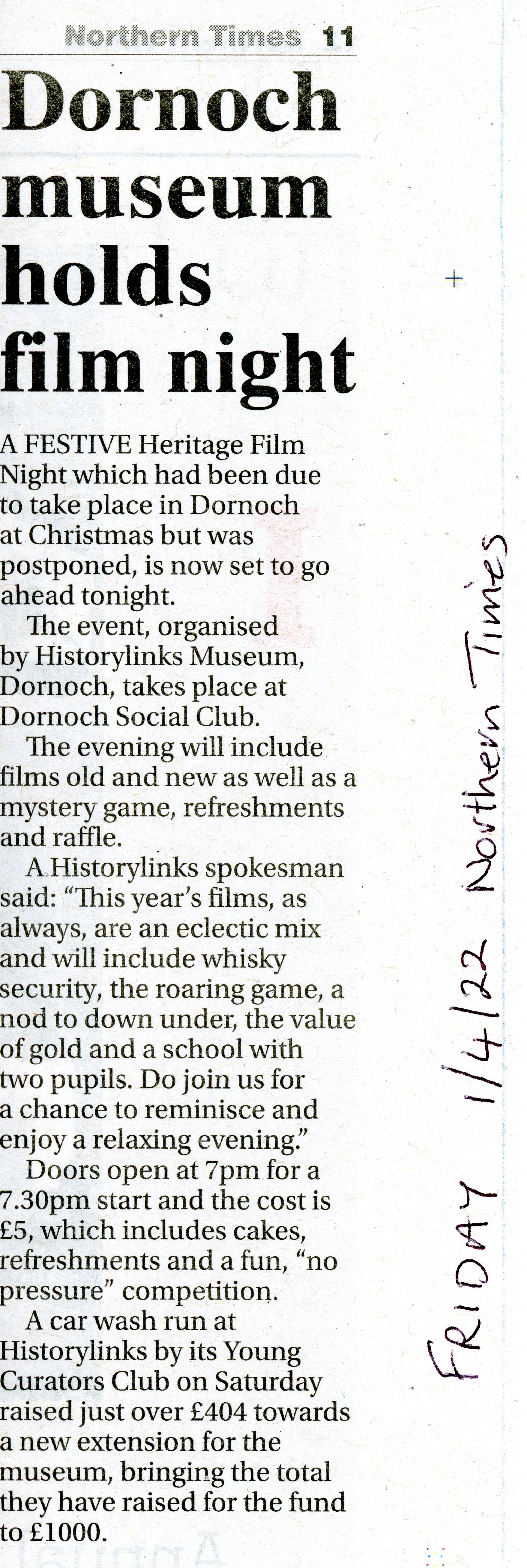 Cutting from the Northern Times of 1/4/2022 giving notice of the Heritage Society film night and reporting the car wash run by the Young Curators.