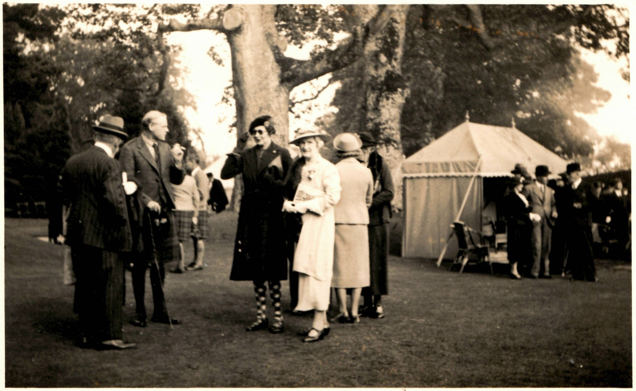 Monochrome photograph, with Postcard format on the reverse, showing Duke of Sutherland’s party (and Duchess?) at a gathering on Cathedral Green. See also picture #15060