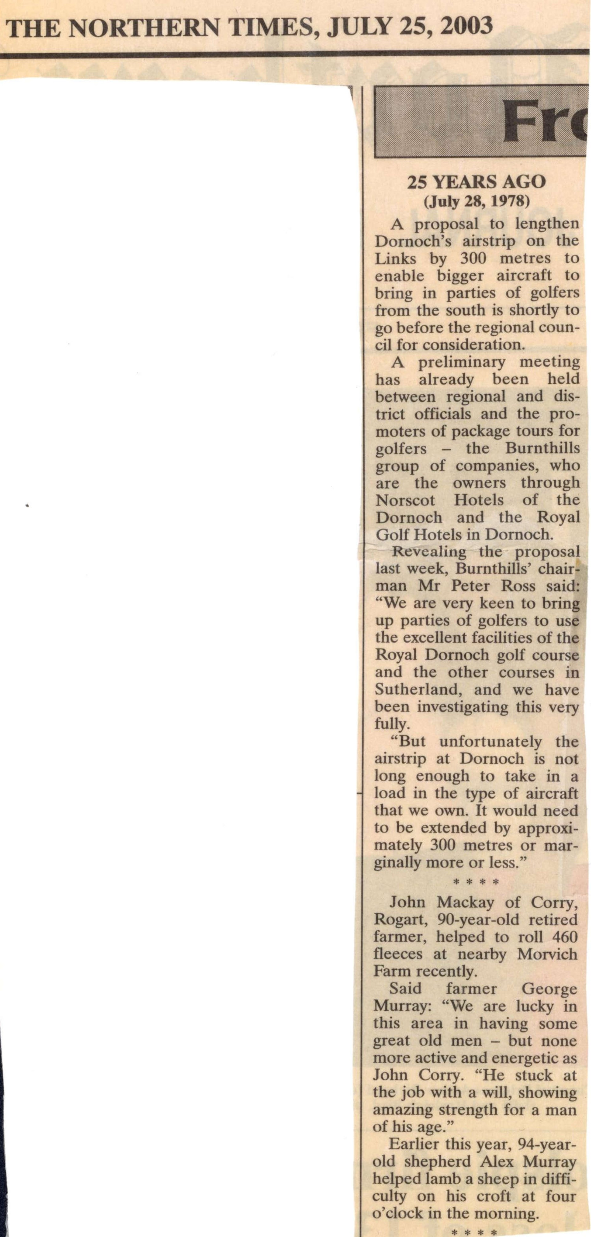 'From 25 years ago' extract from the Northern Times published July 25, 2003 reporting on a proposal, to go before the regional council, for consideration to lengthen Dornoch's airstrip by 300 metres to enable bigger aircraft to bring in parties of golfers from the south.