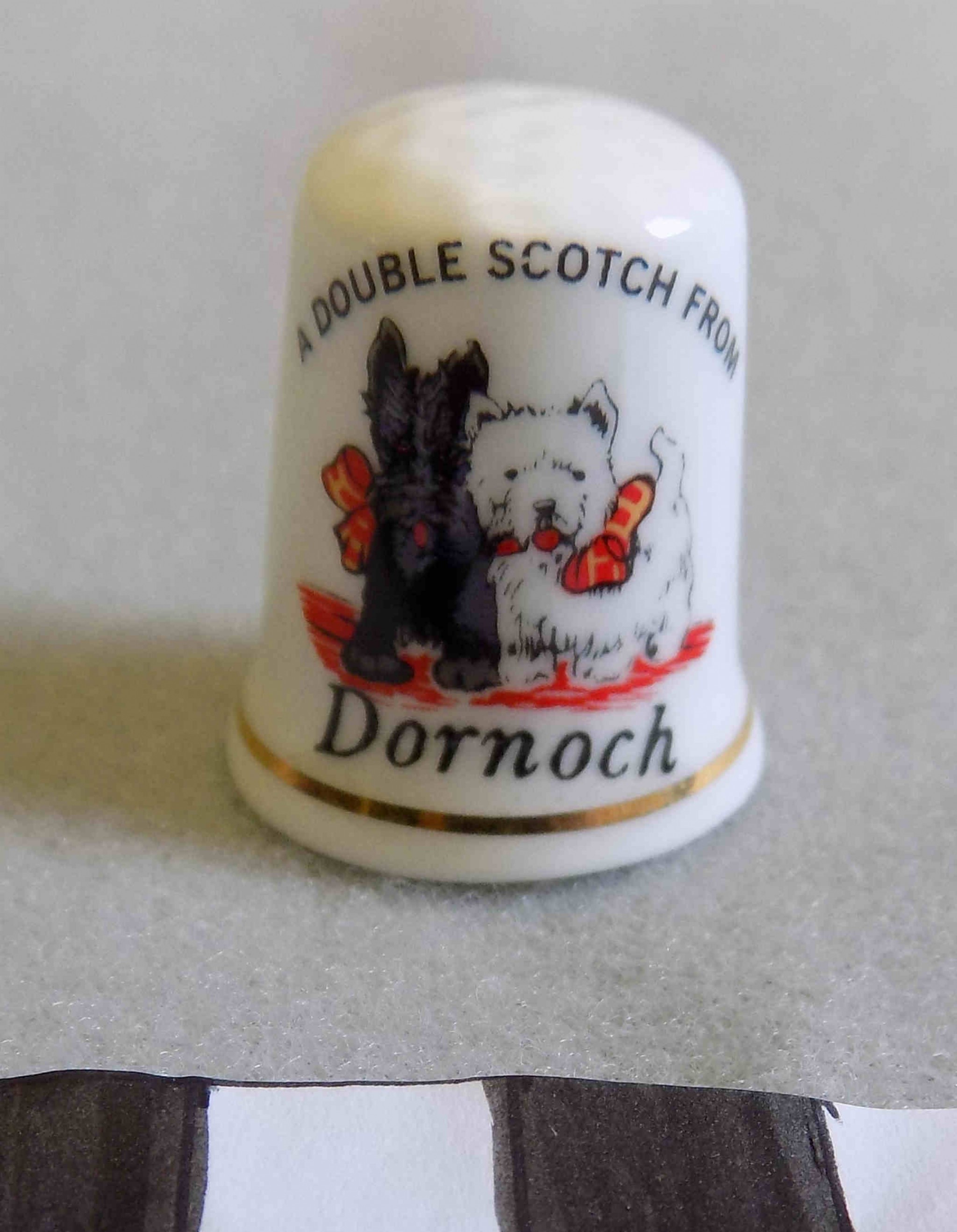 Fine bone china thimble - white with gold band around base. Illustrated with two dogs, a black Scottie and a white West Highland Terrier. Printed Caledonia Fine China on inside.