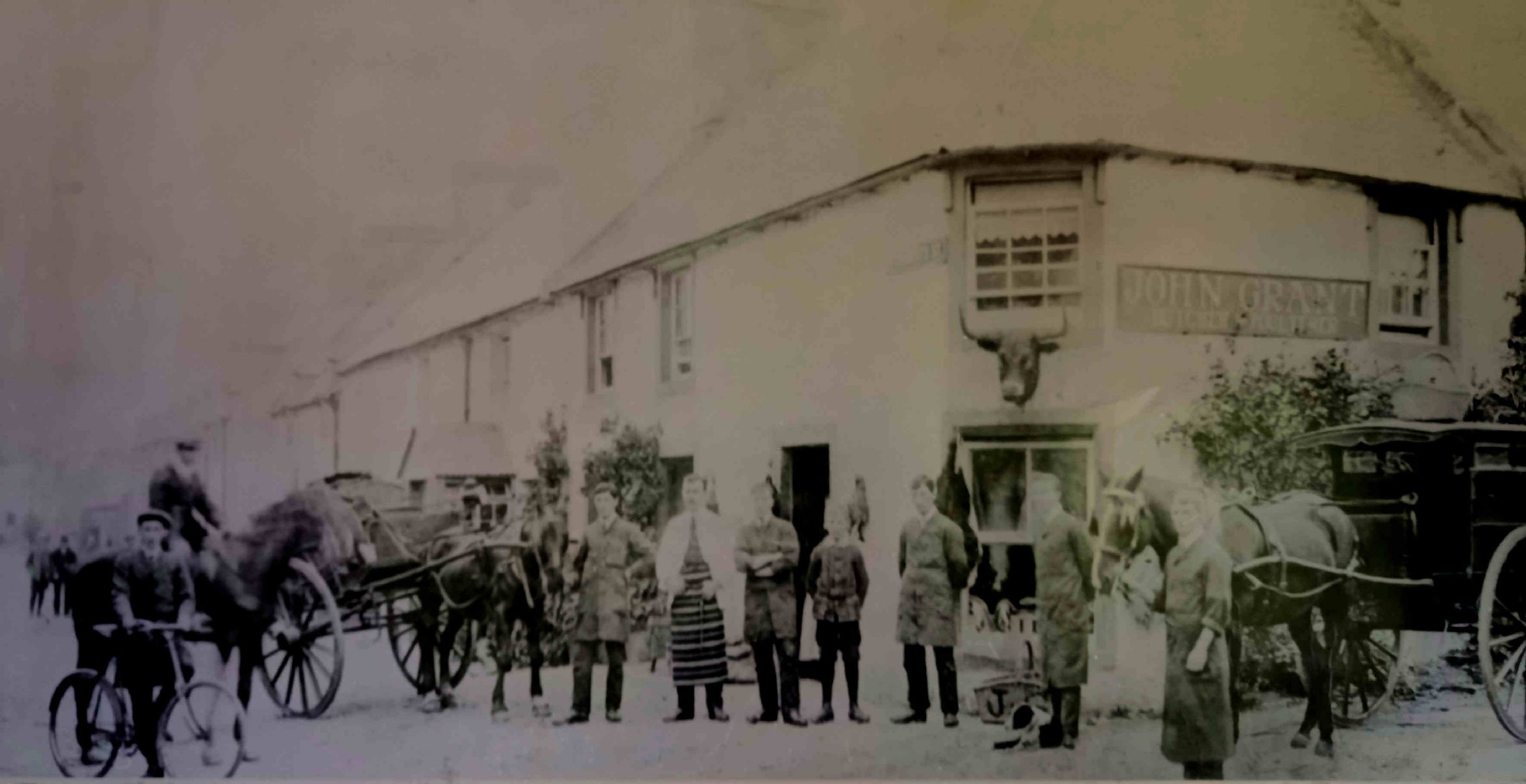 Copy of an enlarged photograph, mounted on foam board, of a group of staff standing outside Grant's shop on the corner of St Gilbert's Street. (The original copy faintly shows the street name plate which is to the left of the window above the bull's head.) Carcasses are visible inside the window above which there is the mounted bull's head. John Grant is mounted on the horse 'Puntin' on the left, and Tom Hardie is on the bicycle. In extended line shows left to right: Willie McCulloch, Charles Grant, J Mackay (killed in WWI), D Beattie, Danny McCulloch, and Robert Grant holding 'Arthur'