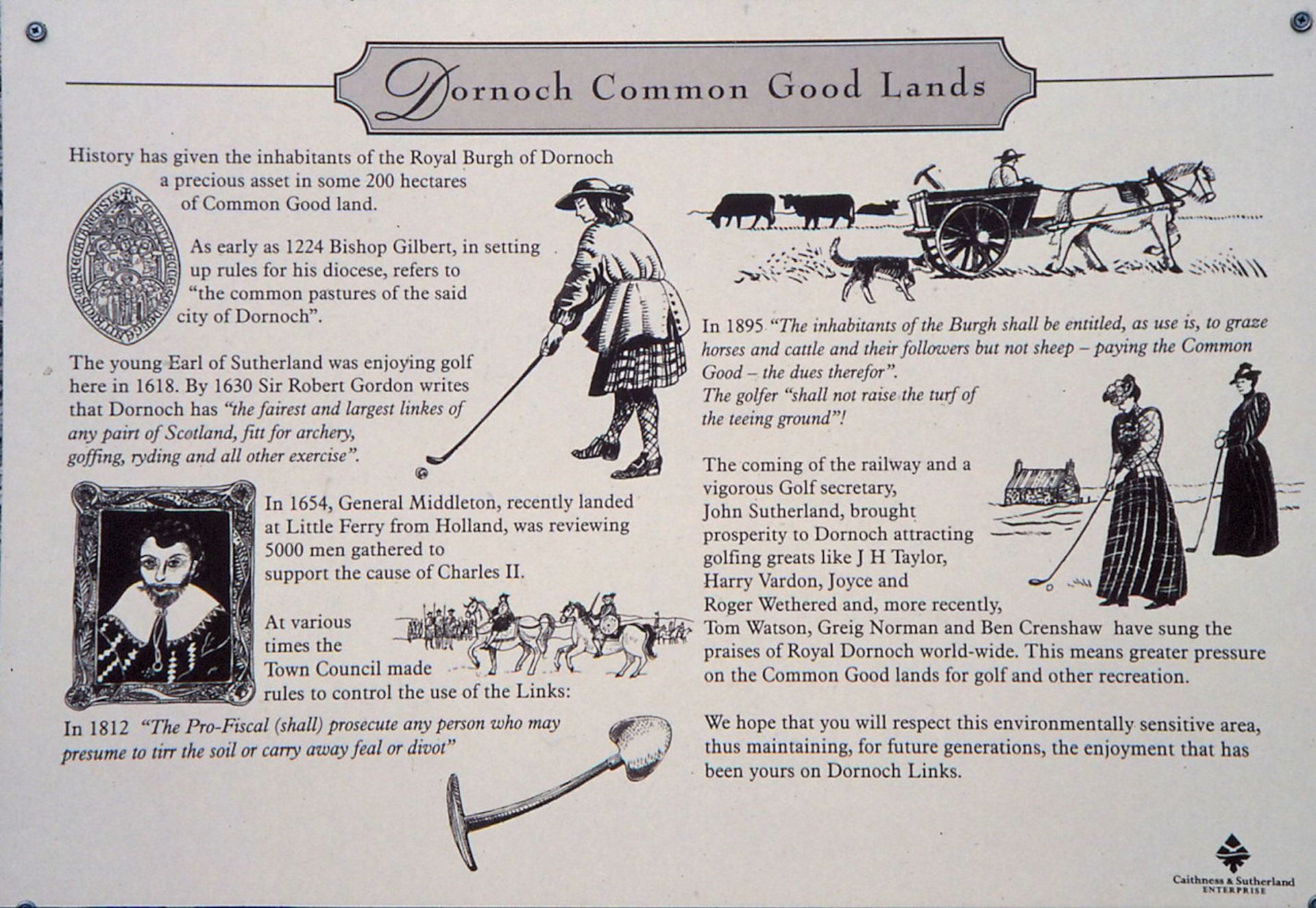 Colour slide of Common Good Land sign outlining the history of Dornoch Common Good Lands. Includes reference to golf on the links and the build of the light railway.