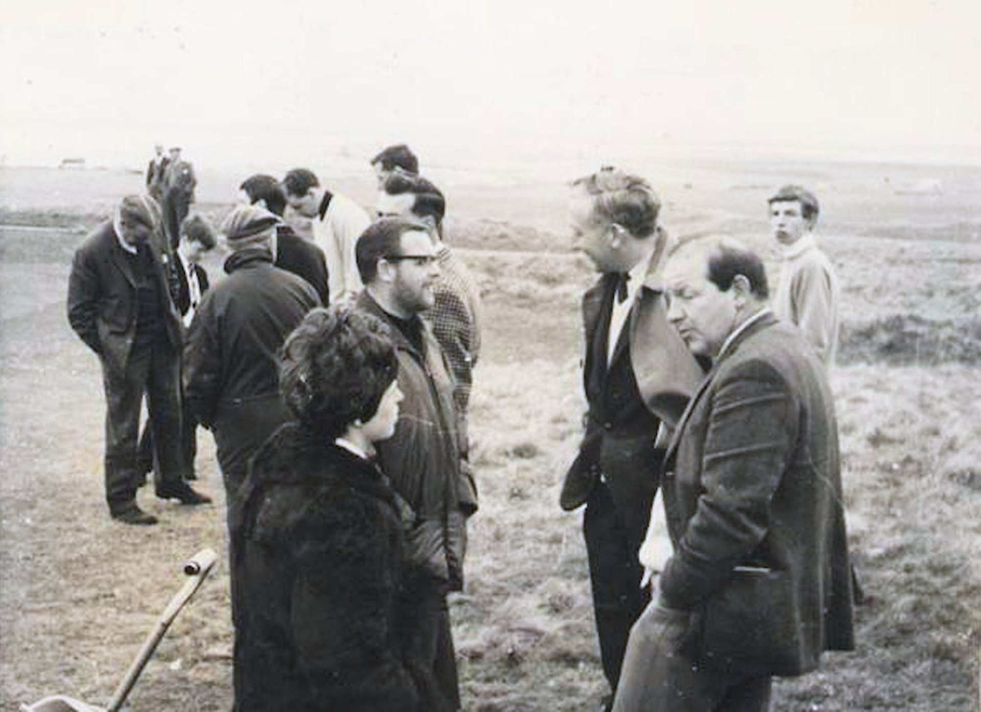 Monochrome photograph of a group of people gathered at the royal Dornoch with front right the journalist Norman Mair.