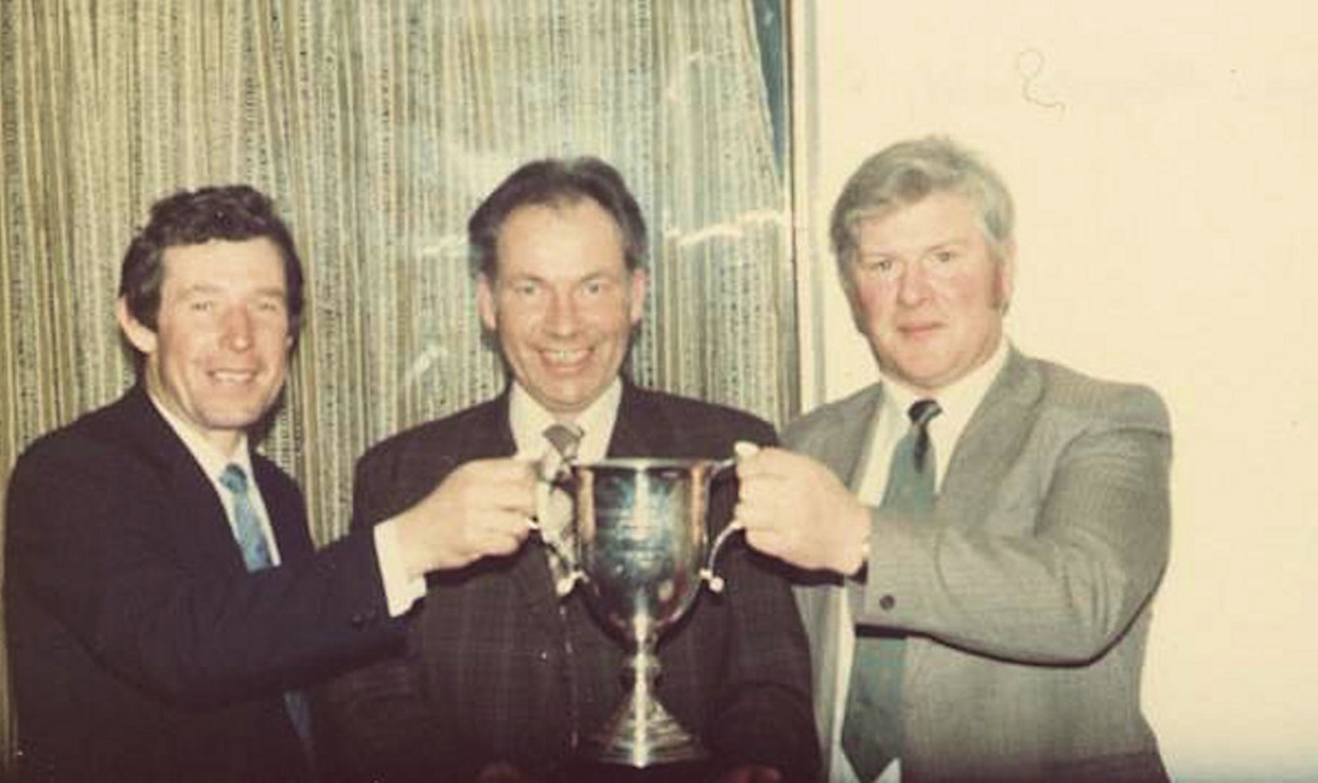 Colour photograph of George Mcdonald, Willie Cumming and Jack MacKay holding a silver cup prize at Royal Dornoch.