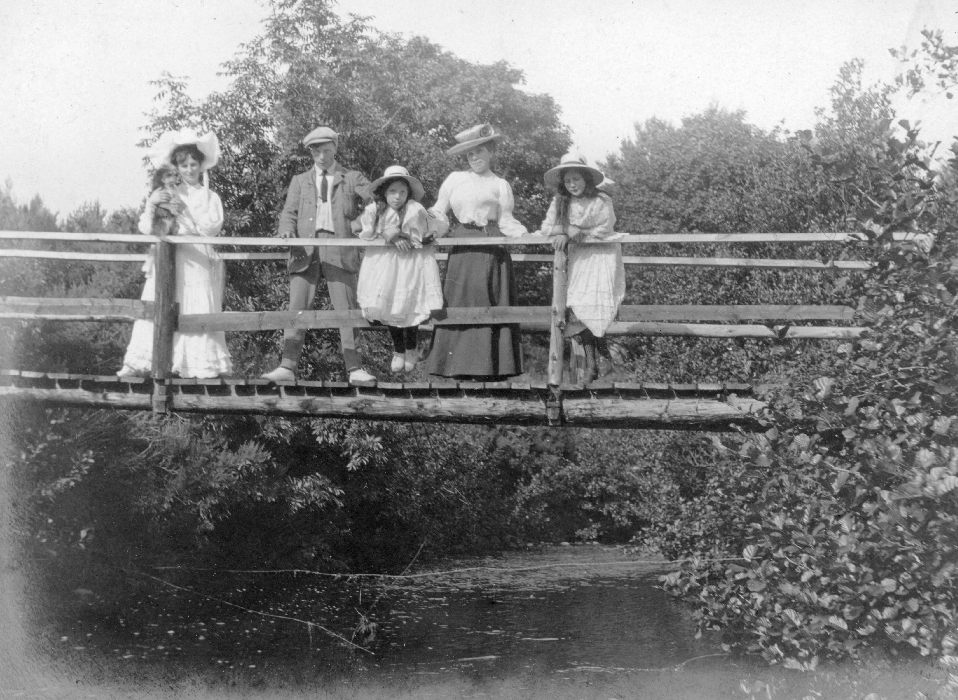 Monochrome photograph of a Grant family group standing on a wooden bridge.