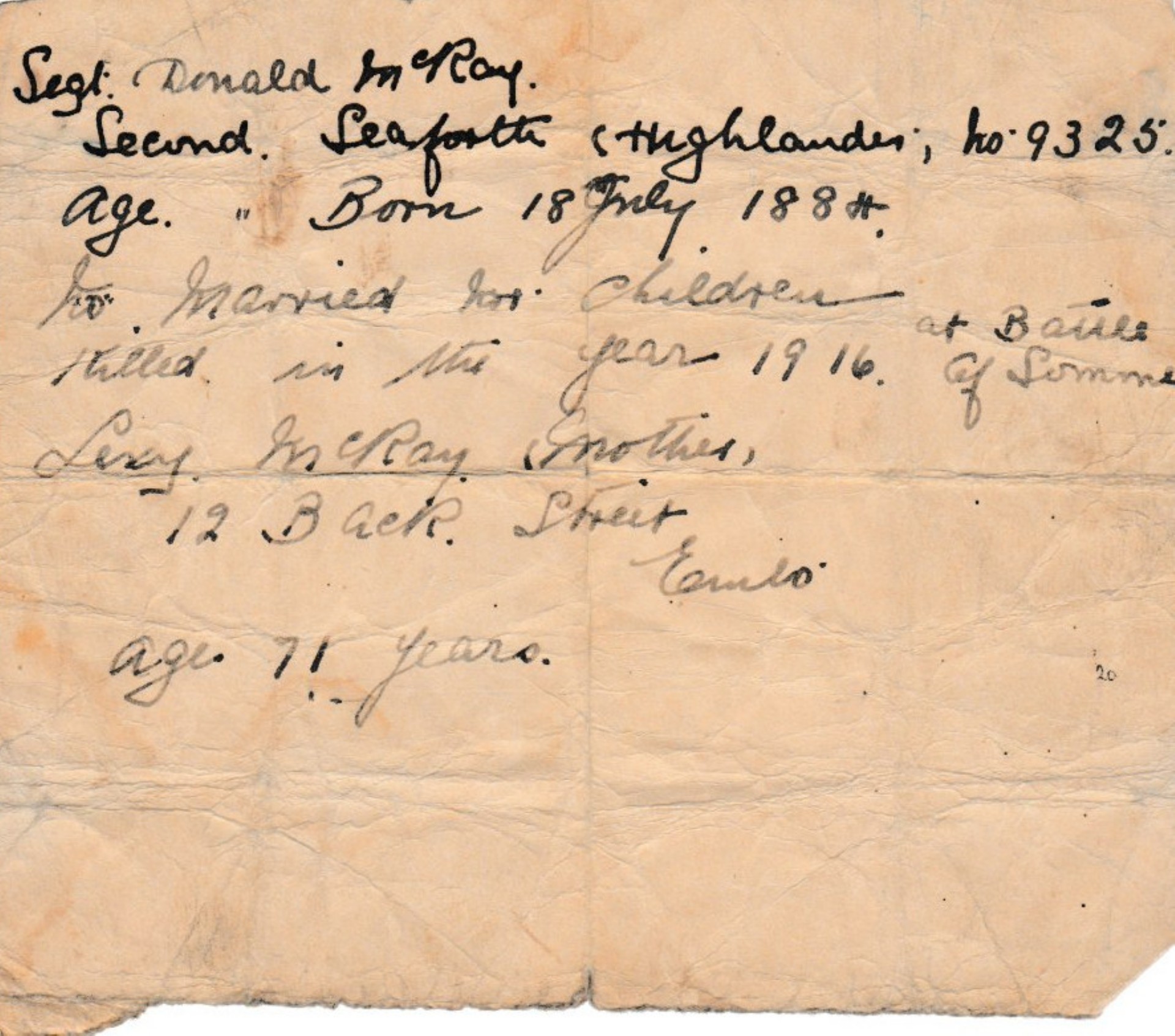 A handwritten note about Donald MacKay written by his mother Lexy Mackay with given address 12 Back Street Embo