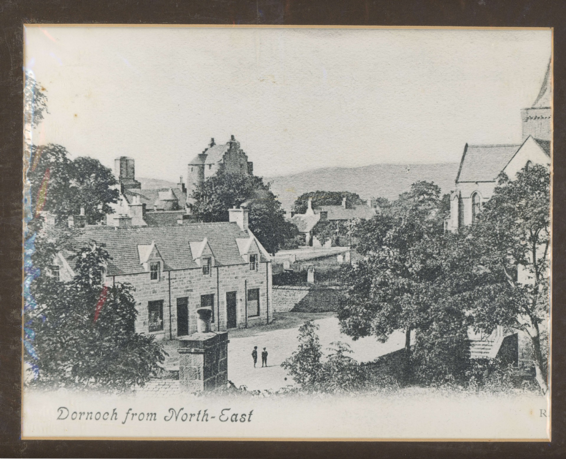 Monochrome photograph mounted in a brown card of Dornoch viewed from the north-east