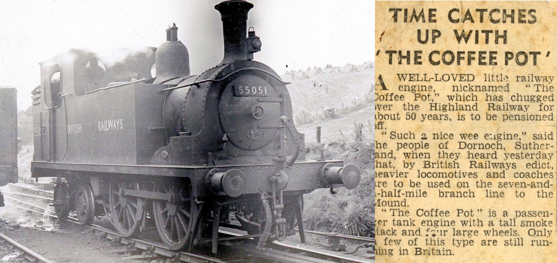 Digital document with an extract from the Northern Times recording the pensioning off of the passenger tank engine known locally as the 'Coffee Pot' after 50 years service on the Dornoch Railway branch line.