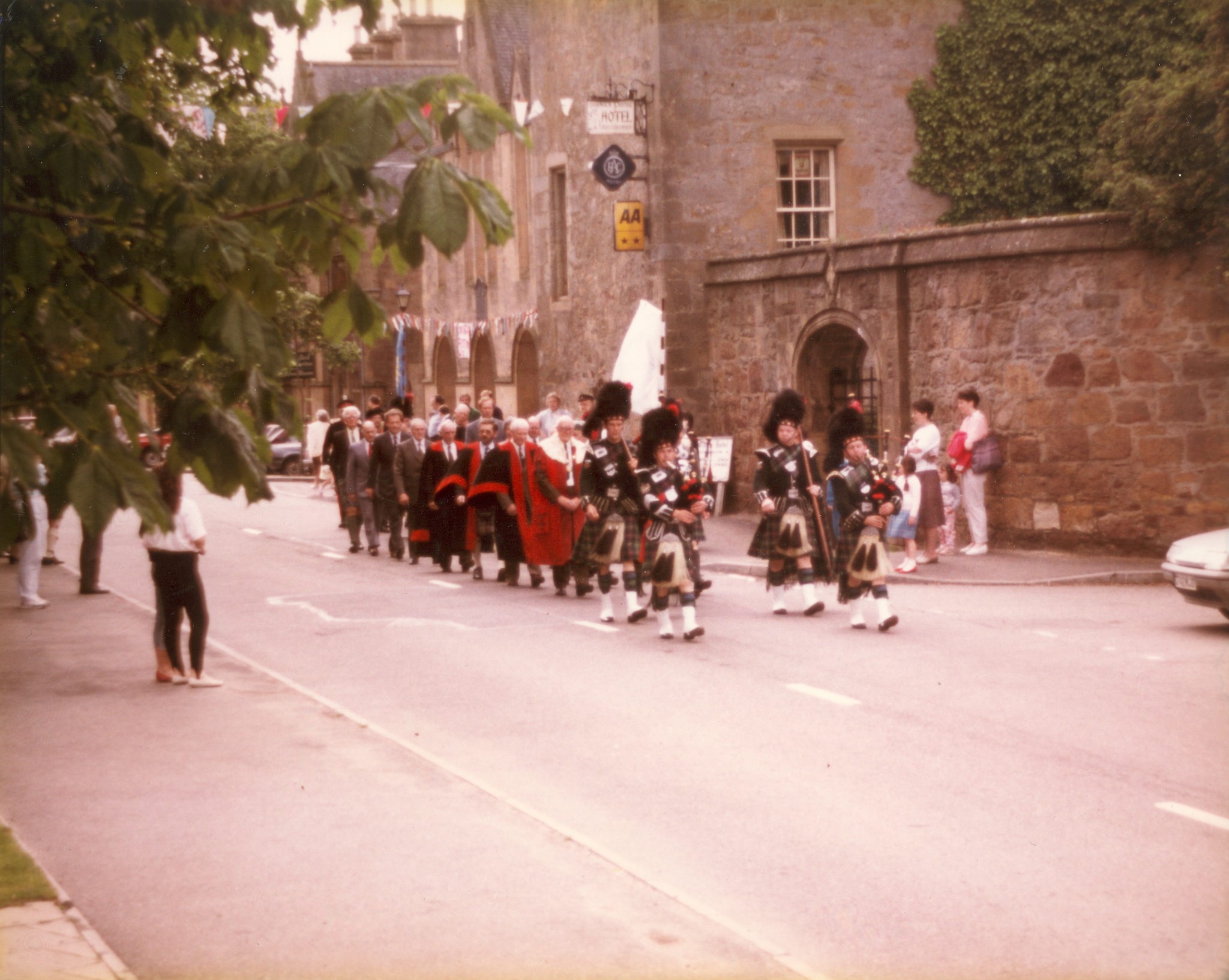Collection of colour photographs of the parade for the presentation of the Grant of Arms and Chairman's Badge tp Dornoch Community Council. The parade assembled in Dornoch Square and marched to the Cathedral West door via Castle Street.