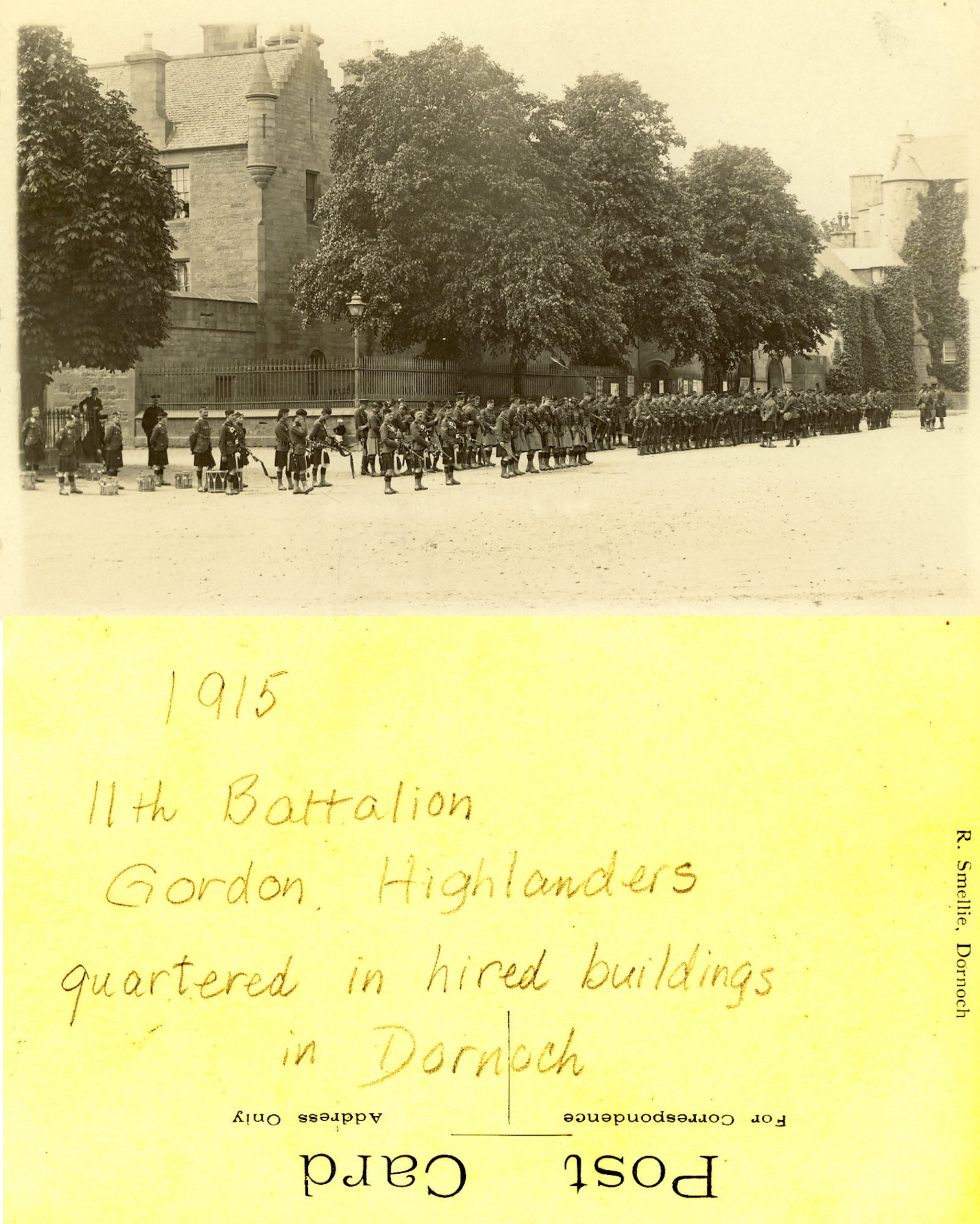 Monochrom postcard, part of the collection sent to members of the Forsyth family in Edinburgh, Pittsburgh and New York. Monochrome photograph of Gordon Highlanders parade, with pipes and drums, formed up in the Square, Dornoch. Reverse is unaddressed but bears the inscription '1915 11th Battalion Gordon Highlanders quartered in hired buildings in Dornoch'.