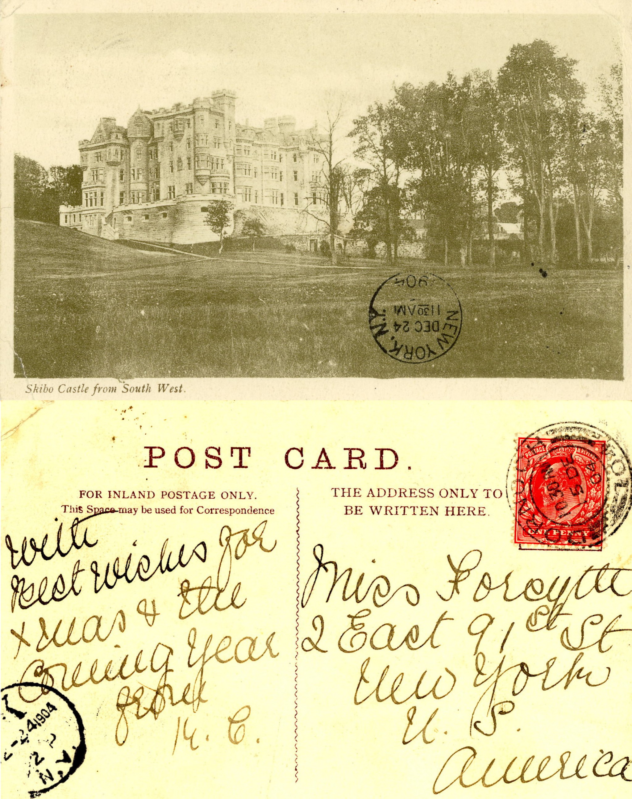 Monochrome postcard, part of the collection sent to members of the Forsyth family in Edinburgh, Pittsburgh and New York. Monochrome photograph with inscription 'Skibo Castle from south west'. Front bears a New York postmark Dec 24 11.30 AM 1904 Reverse shows address of Miss Forsyth in New York. Edward VII red one penny postage stamp with postmark Dornoch 10.30 AM 5 Dec 04.