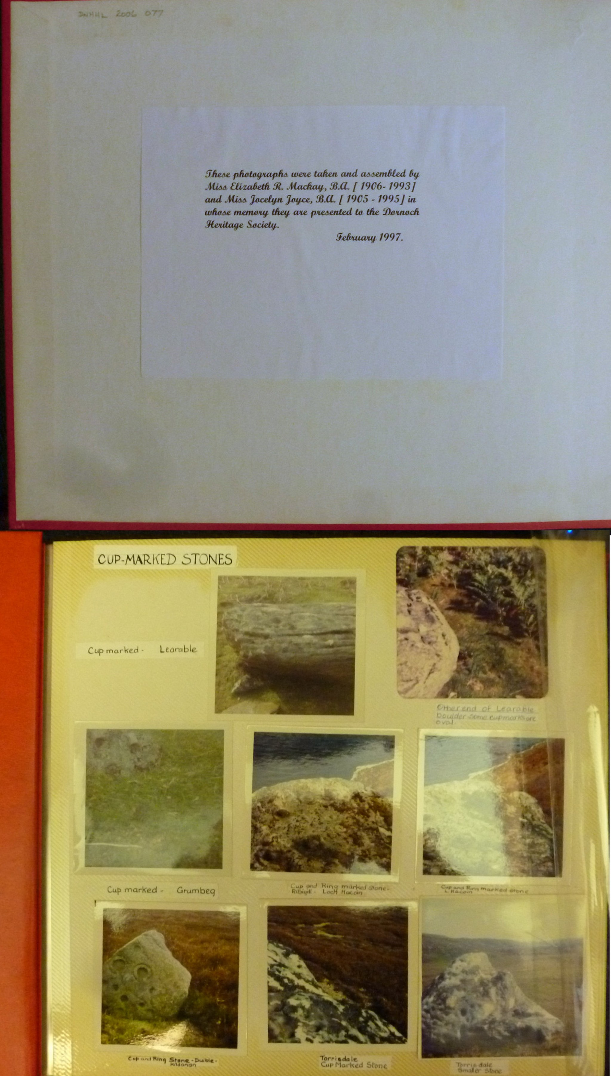 Photograph album of Miss Elizabeth Mackay BA (1906 - 1993) and Miss Jocelyn Joyce BA (1905 - 1995) with a red leatherette cover and 20 pages of multiple colour photographs of: cup marked, standing and Pictish stones, stone rows, fortifications, castles and "local history". The inside cover bears a label marking the donation of the album to Dornoch Heritage Society in February 1997 (A second album was also donated to the Society with 48 pages of photographs catalogued as 2005_064_001 - see picture #1663