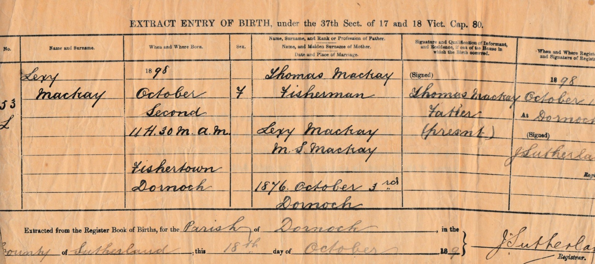 Extract of Entry of Birth Lexy Mackay born October second 1889 at 11.30 a.m. in Fishertown Dornoch. Father Thomas Mackay fisherman, mother Lexy Mackay married October 3rd 1876 at Dornoch. Informant Thomas Mackay father on 18th October 1898 at Dornoch.