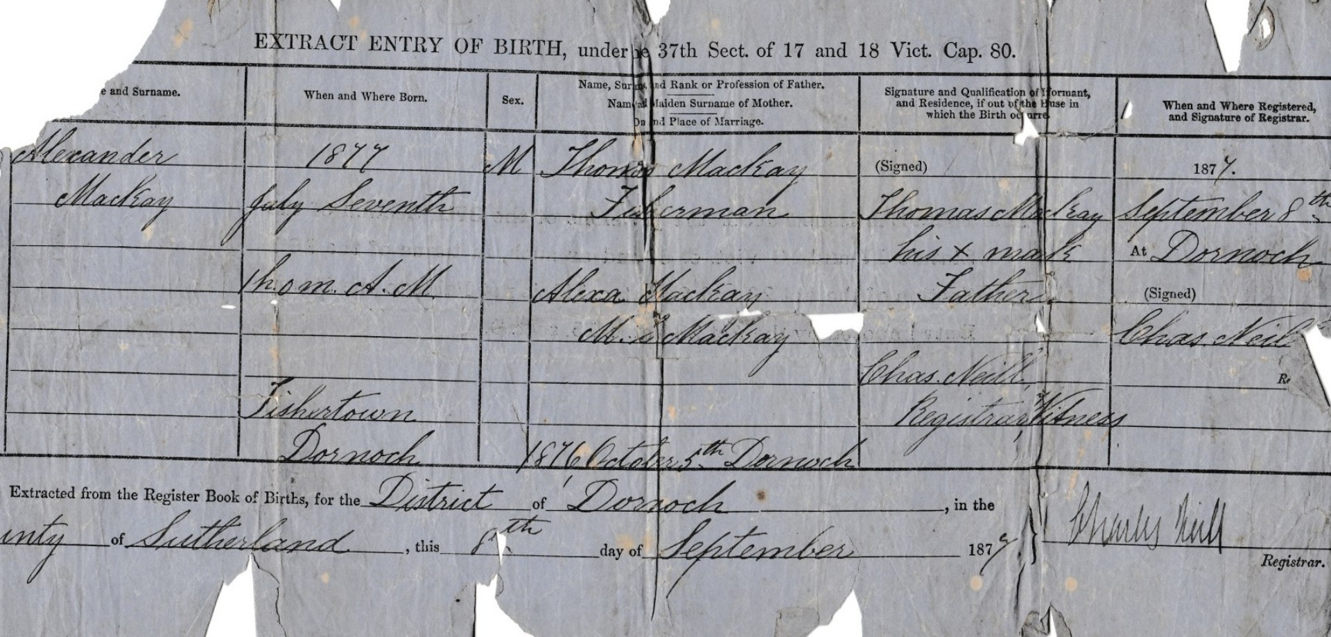 Birth certificate of Alexander Mackay born seventh July 1877 at Fishertown Dornoch, father Thomas Mackay Fisherman mother Alex Mackay place of marriage Dornoch 5th October 1876, birth registered September 8th 1877 at Dornoch. The certificate is in a torn, fragile state.