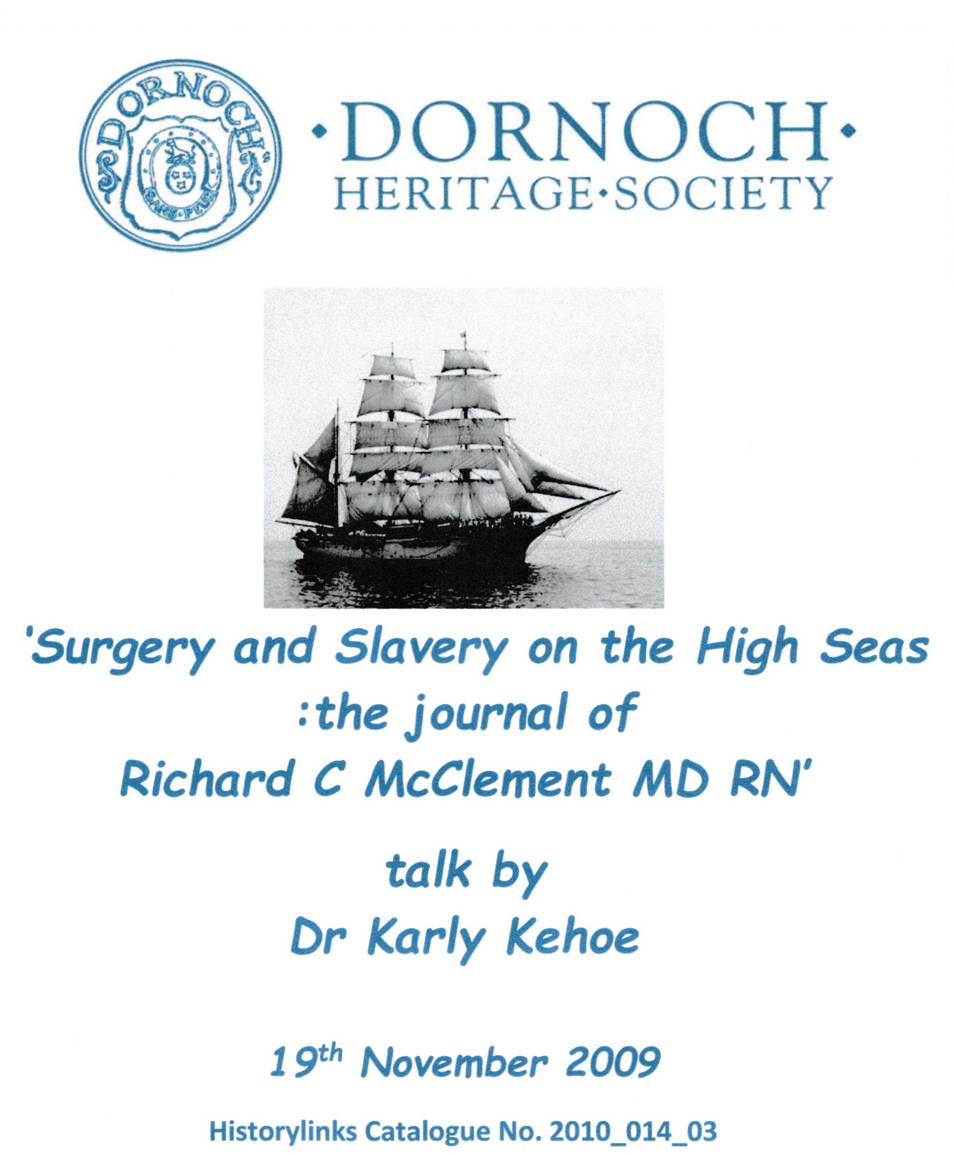 Talk to the Dornoch Heritage Society on 'Surgery and Slavery on the High Seas: the Journal of Richard C McClement MD RN' by Dr Karly Kehoe given on 19th November 2009, originally recorded on a mini-disc. As part of the project to enhance museum virtual presence, in 2025 the mini-disc was converted to MP3 format and, after appropriate editing, the MP3 file was transcribed, as necessary further edited to become a pdf file. This enabled direct on-line access to the content of the talk using the pdf link below.