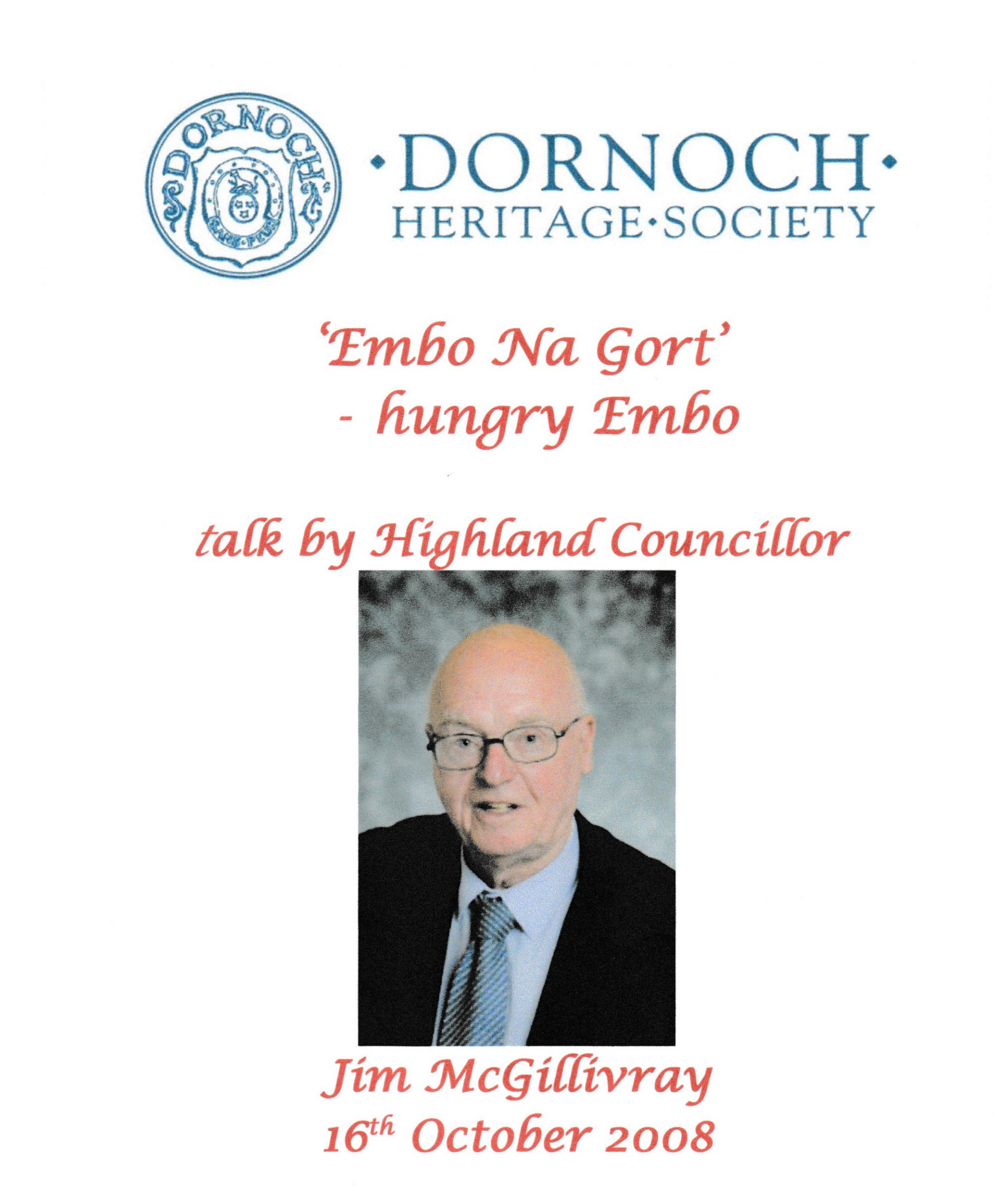 The mini disc recording of a talk on 'Embo Na Gort' by Councillor Jim McGillivray on 16 October 2008 was converted to MP3 in 2025, edited and transcribed to a pdf file directly accessible using the link below.