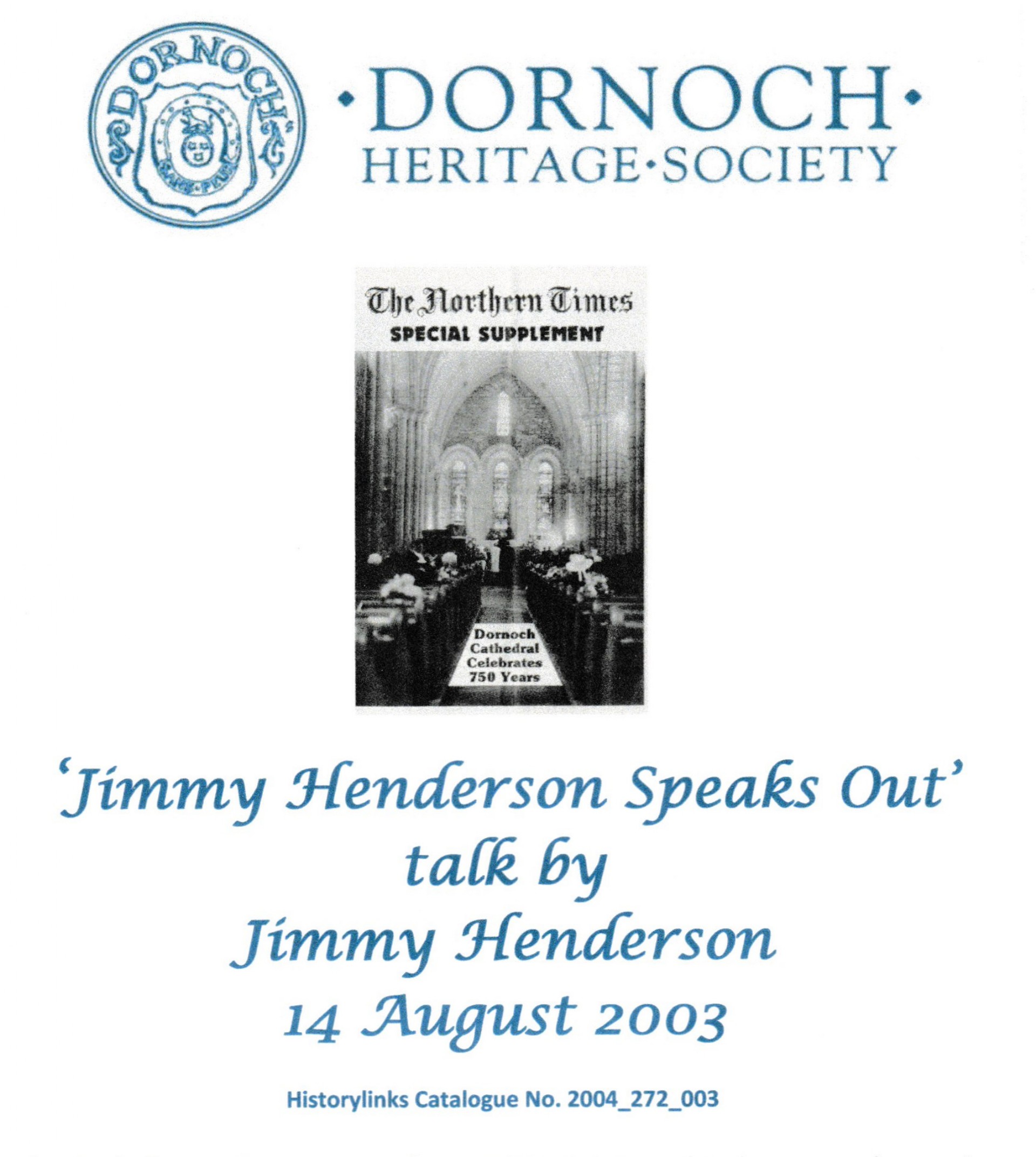 A talk by Jimmy Henderson, past Editor of the Northern Times, entitled 'Jimmy Henderson Speaks Out' was presented to to the Dornoch Heritage Society on 14 August 2003 and was simultaneously recorded on a mini disc. As part of a 2025 project the mini disc was converted to MP3 format and then transcribed to produce a pdf file directly accessible from the Historylinks Archive.