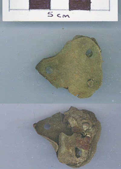 Pic 11302: Objects discovered on Pitgrudy Farm - Copper alloy fitting/plate