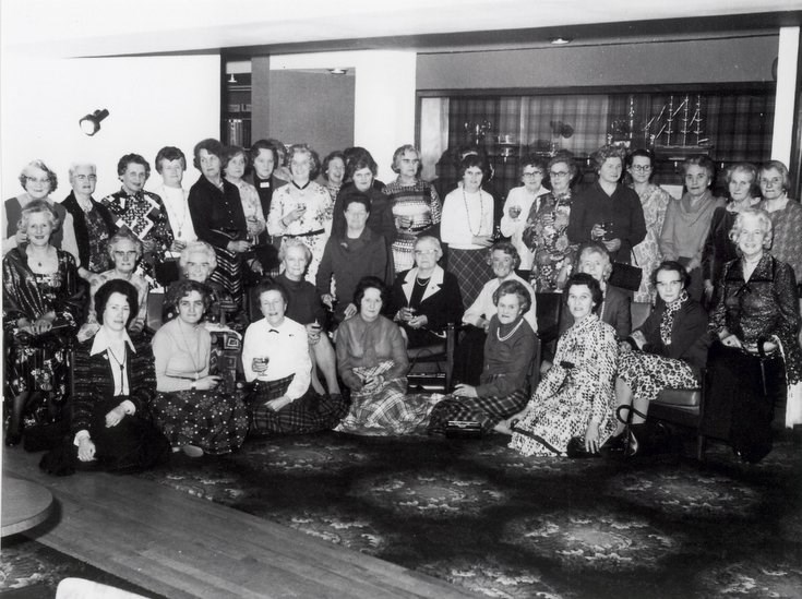 Seventh of a selection of 50 objects from Dornoch Scottish Women's Rural Instuture archives 1926 to 2011: 50th (Golden Jubilee Feb 17th 1976) party. Front row includes Jessie Bell (2nd from left) The row of ladies seated behind are the founder members able to attend including 4th from left Isa Skinner and 3rd from right Janetta Arbuthnott (both seen cutting cake in 018)