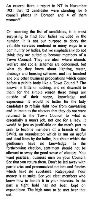 Thirty-ninth of a selection of 50 objects from Dornoch Scottish Women's Rural Instuture archives 1926 to 2011: Extract from the Northern Times of November 1931 recording that 12 candidates were standing for 6 council places in Dornoch and to the surprise of many 4 of them were women. The account questioned "....what do they know about lighting, water, drainage and housed schemes, and the hundred and one other business propositions which come before a public body like a Town Council?" "Ratepayers! Your money is at stake. See you elect members who know how to handle it in your interests"